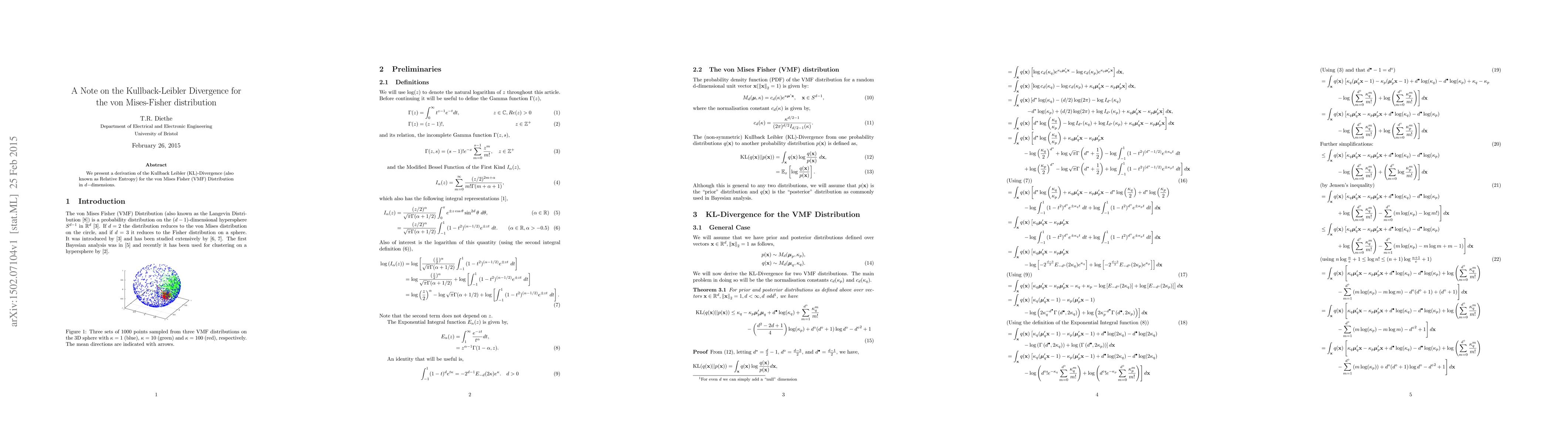 Summary: This paper derives the Kullback-Leibler Divergence for the von Mises-Fisher distribution in $d$-dimensions, providing a mathematical expression for the relative entropy between two VMF distributions. This derivation aids in understanding the statistical distance between different VMF distributions in multivariate circular statistics.
