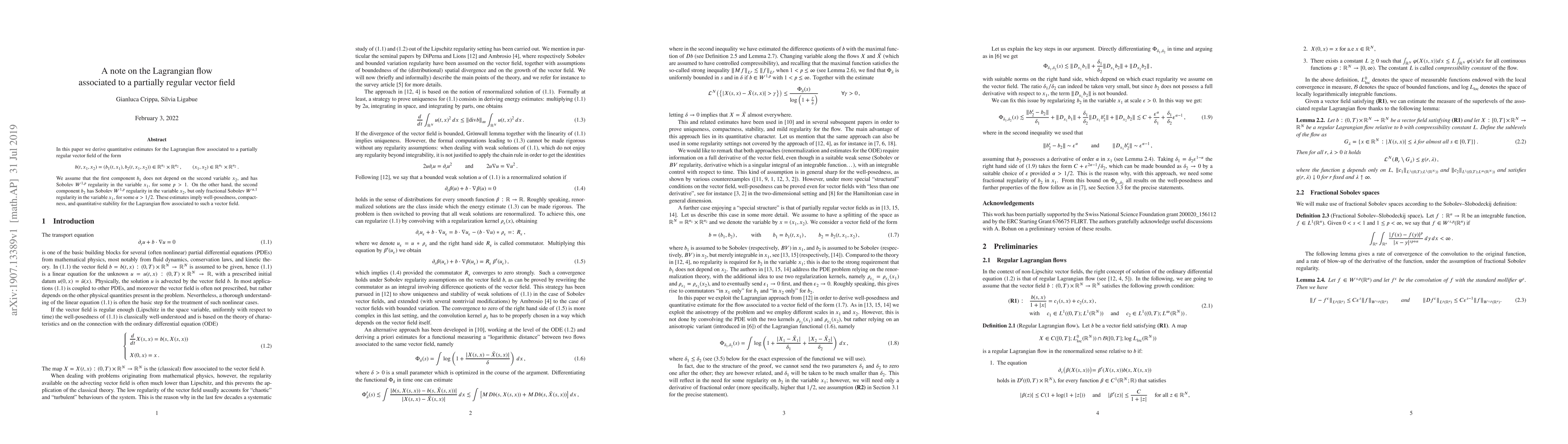 In this paper we derive quantitative estimates for the Lagrangian flow associated to a partially regular vector field of the form $$ b(t,x_1,x_2) = (b_1(t,x_1),b_2(t,x_1,x_2)) \in {\mathbb R}^{n_1}\times{\mathbb R}^{n_2} \,, \qquad (x_1,x_2)\in{\mathbb R}^{n_1}\times{\mathbb R}^{n_2}\,. $$ We assume that the first component $b_1$ does not depend on the second variable $x_2$, and has Sobolev $W^{1,p}$ regularity in the variable $x_1$, for some $p>1$. On the other hand, the second component $b_2$ has Sobolev $W^{1,p}$ regularity in the variable $x_2$, but only fractional Sobolev $W^{\alpha,1}$ regularity in the variable $x_1$, for some $\alpha>1/2$. These estimates imply well-posedness, compactness, and quantitative stability for the Lagrangian flow associated to such a vector field.