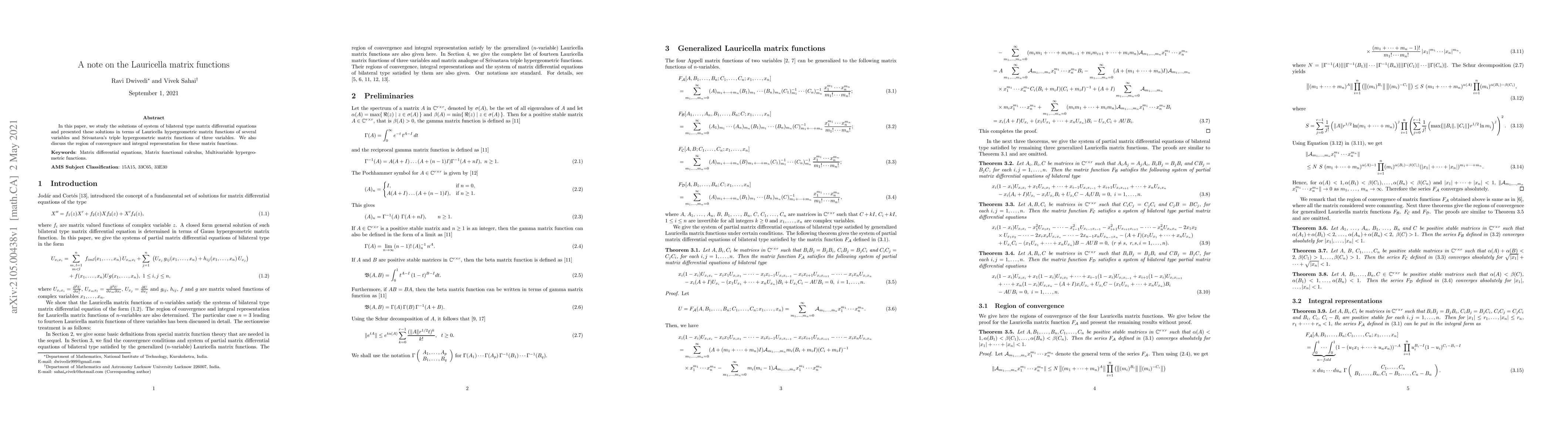 In this paper, we study the solutions of the system of bilateral type matrix differential equations and presented these solutions in terms of Lauricella hypergeometric matrix functions of several variables and Srivastava's triple hypergeometric matrix functions of three variables. We also discuss the region of convergence and integral representation for these matrix functions.