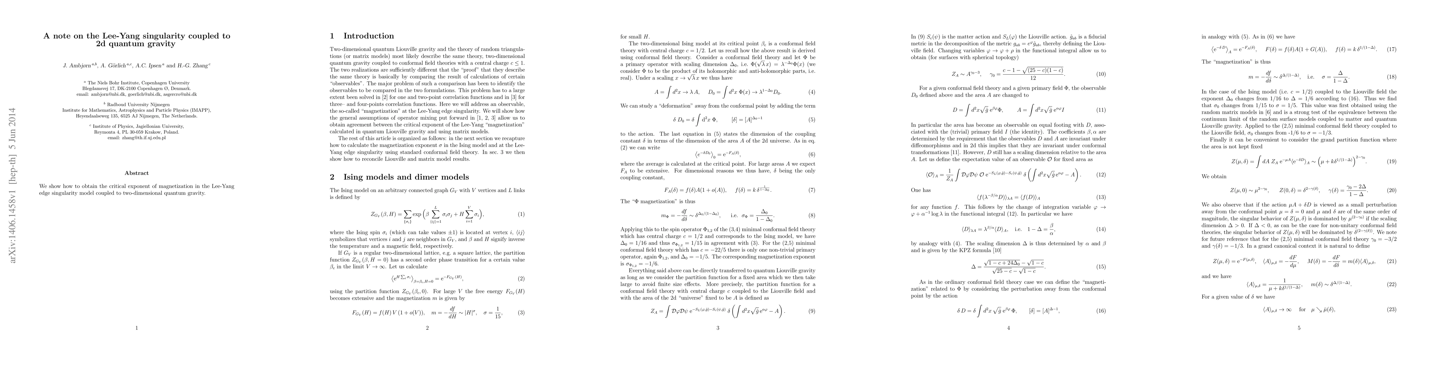 Summary: This paper demonstrates a method to determine the critical exponent of magnetization in the Lee-Yang edge singularity model when coupled with two-dimensional quantum gravity, providing insights into the interplay between statistical mechanics and quantum geometry.