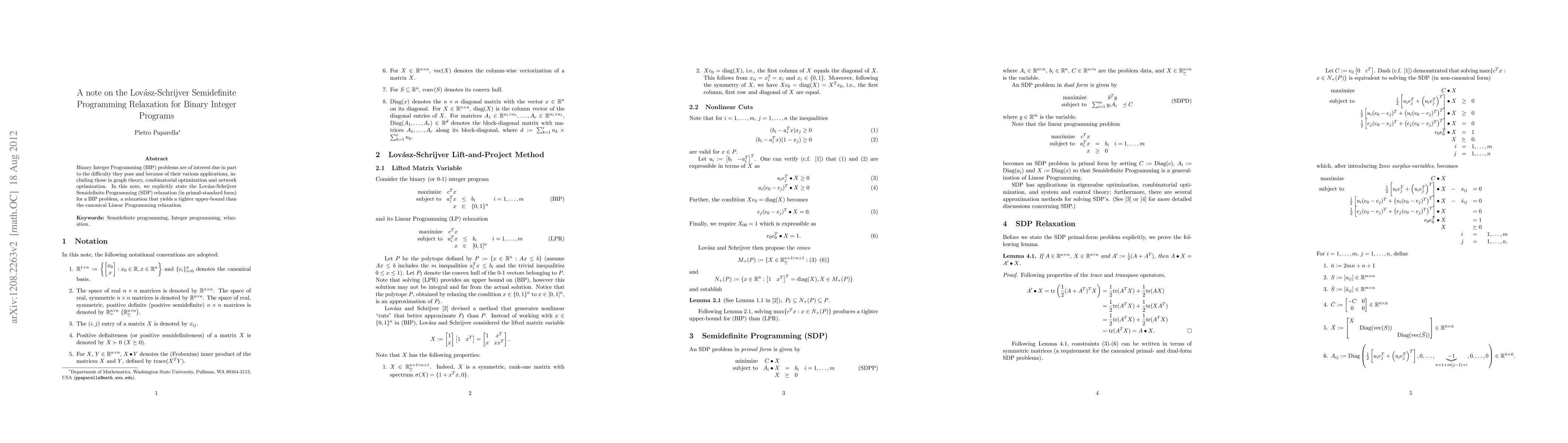 This note presents the Lovasz-Schrijver Semidefinite Programming relaxation for Binary Integer Programs, showing it provides a tighter upper-bound than the standard Linear Programming relaxation, enhancing the solution quality for combinatorial optimization problems.