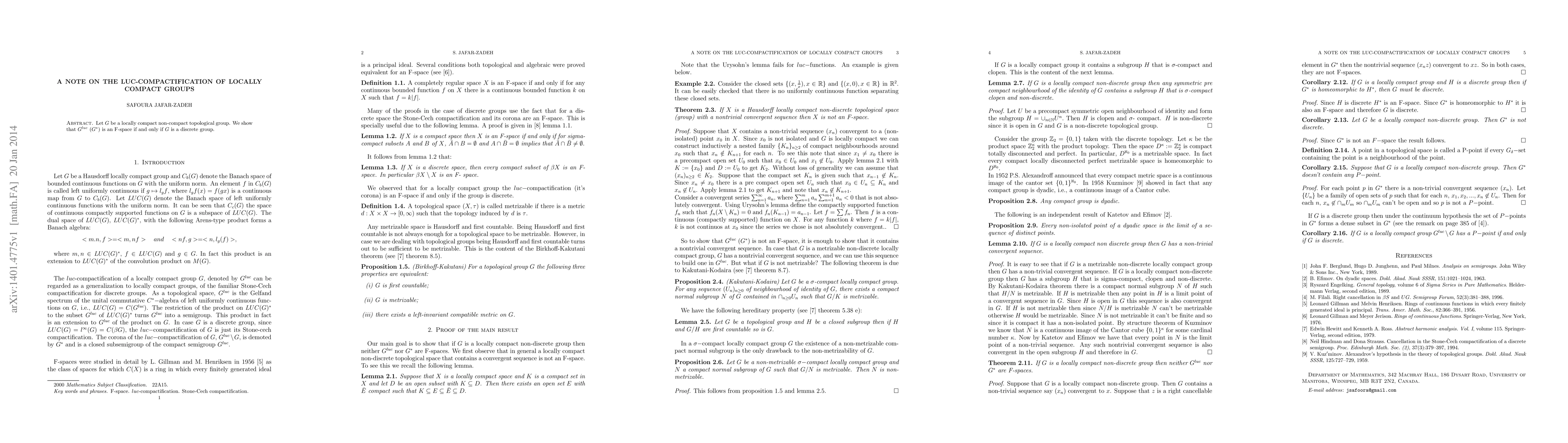 Let $G$ be a locally compact non-compact topological group. We show that $G^{luc}$ ($G^*$) is an F-space if and only if $G$ is a discrete group.