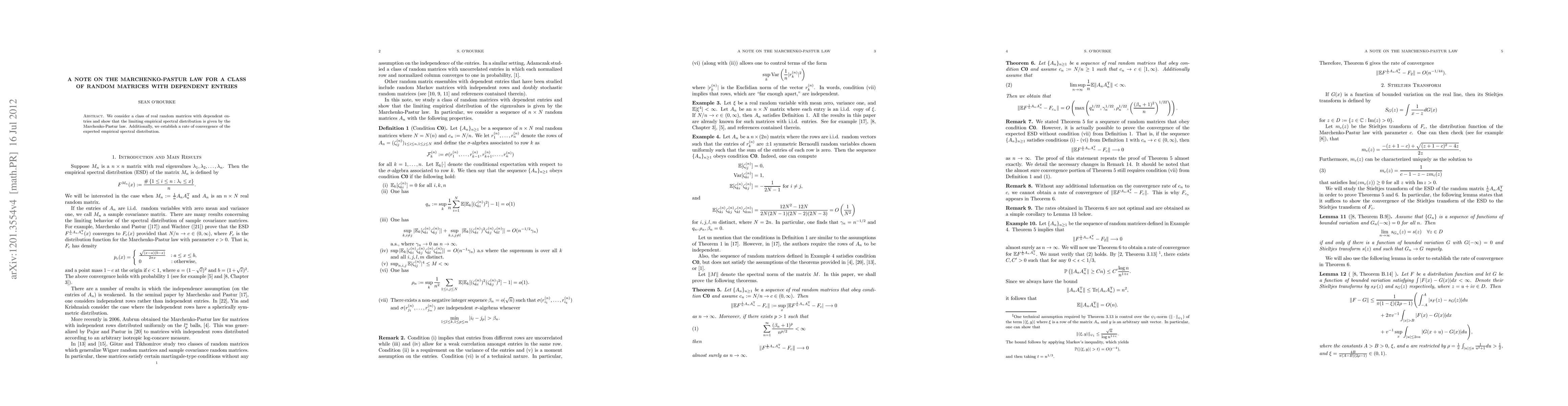 This study investigates real random matrices with dependent entries and demonstrates that their limiting empirical spectral distribution adheres to the Marchenko-Pastur law, with a specified rate of convergence for the expected empirical spectral distribution.