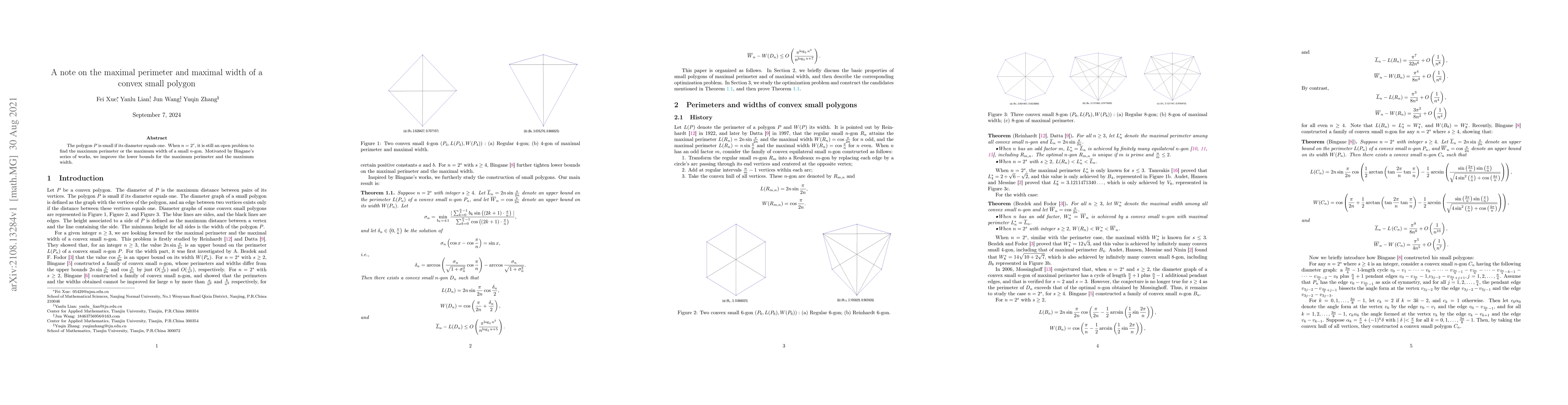The polygon $P$ is small if its diameter equals one. When $n=2^s$, it is still an open problem to find the maximum perimeter or the maximum width of a small $n$-gon. Motivated by Bingane's series of works, we improve the lower bounds for the maximum perimeter and the maximum width.