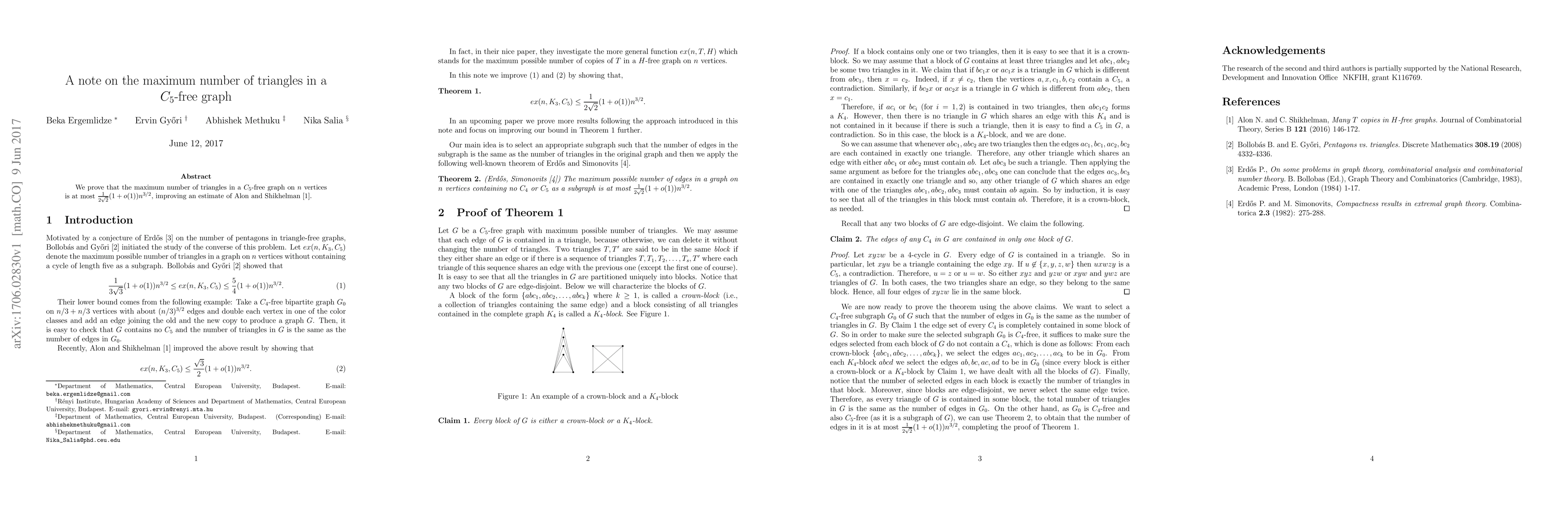 Researchers have proven that a C5-free graph on n vertices can contain at most 1/2 √ 2 (1 + o(1)) n^(3/2) triangles, improving an earlier estimate.