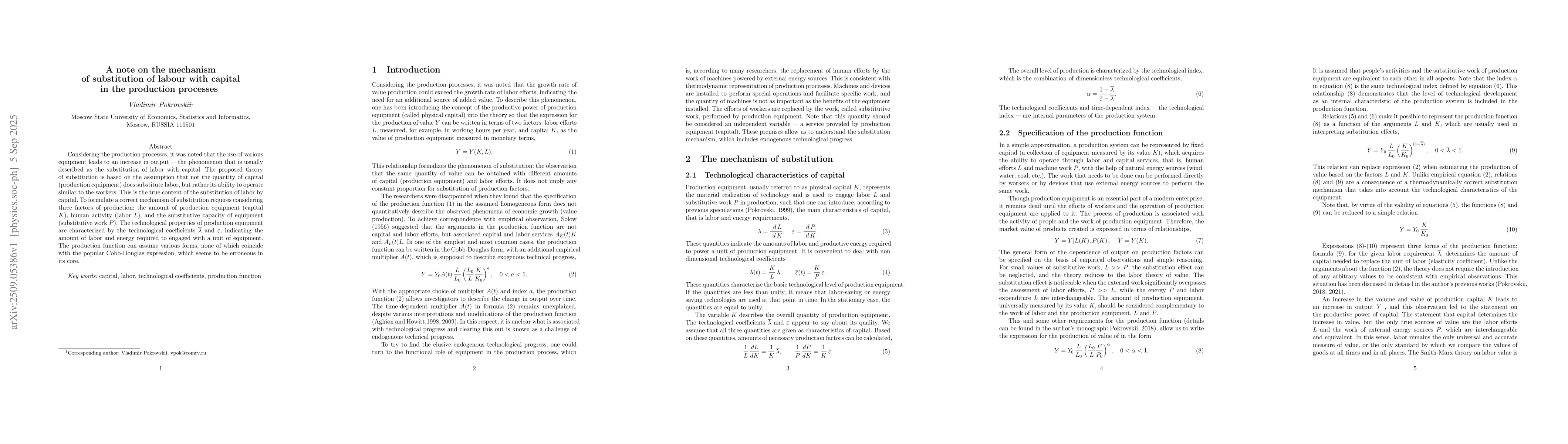 Considering the production processes, it was noted that the use of various equipment leads to an increase in output -- the phenomenon that is usually described as the substitution of labor with capital. The proposed theory of substitution is based on the assumption that not the quantity of capital (production equipment) does substitute labor, but rather its ability to operate similar to the workers. This is the true content of the substitution of labor by capital. To formulate a correct mechanism of substitution requires considering three factors of production: the amount of production equipment (capital $K$), human activity (labor $L$), and the substitutive capacity of equipment (substitutive work $P$). The technological properties of production equipment are characterized by the technological coefficients $\overline \lambda$ and $\overline \varepsilon$, indicating the amount of labor and energy required to engaged with a unit of equipment. The production function can assume various forms, none of which coincide with the popular Cobb-Douglas expression, which seems to be erroneous in its core.