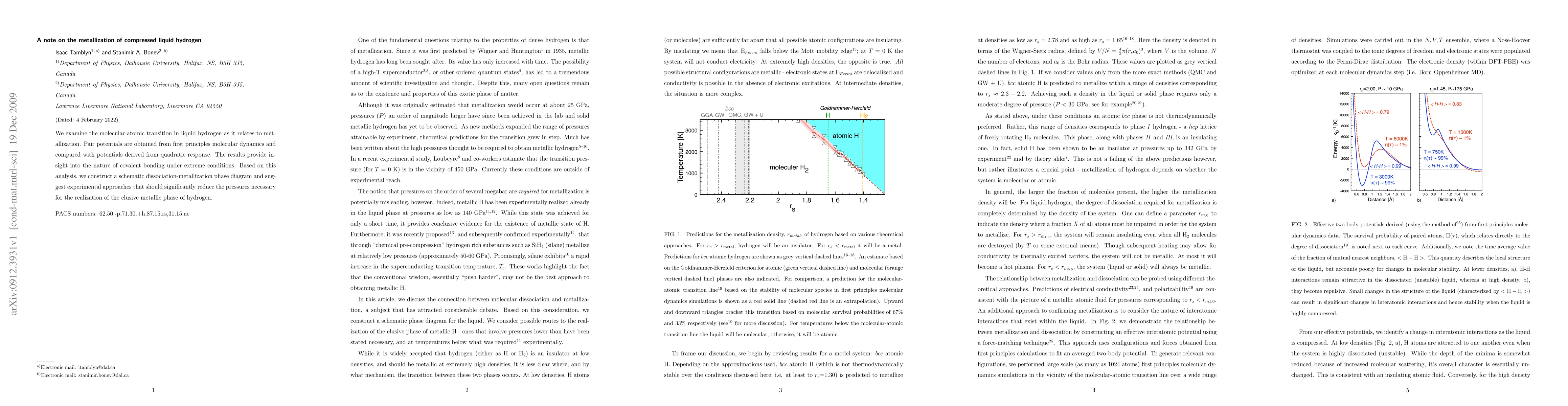 This research investigates the transition from molecular to atomic states in compressed liquid hydrogen, focusing on metallization. It employs first principles molecular dynamics to derive pair potentials and compares them with quadratic response potentials, offering insights into covalent bonding under extreme conditions and proposing a schematic phase diagram for dissociation-metallization, along with suggested experimental methods to achieve the metallic phase at lower pressures.