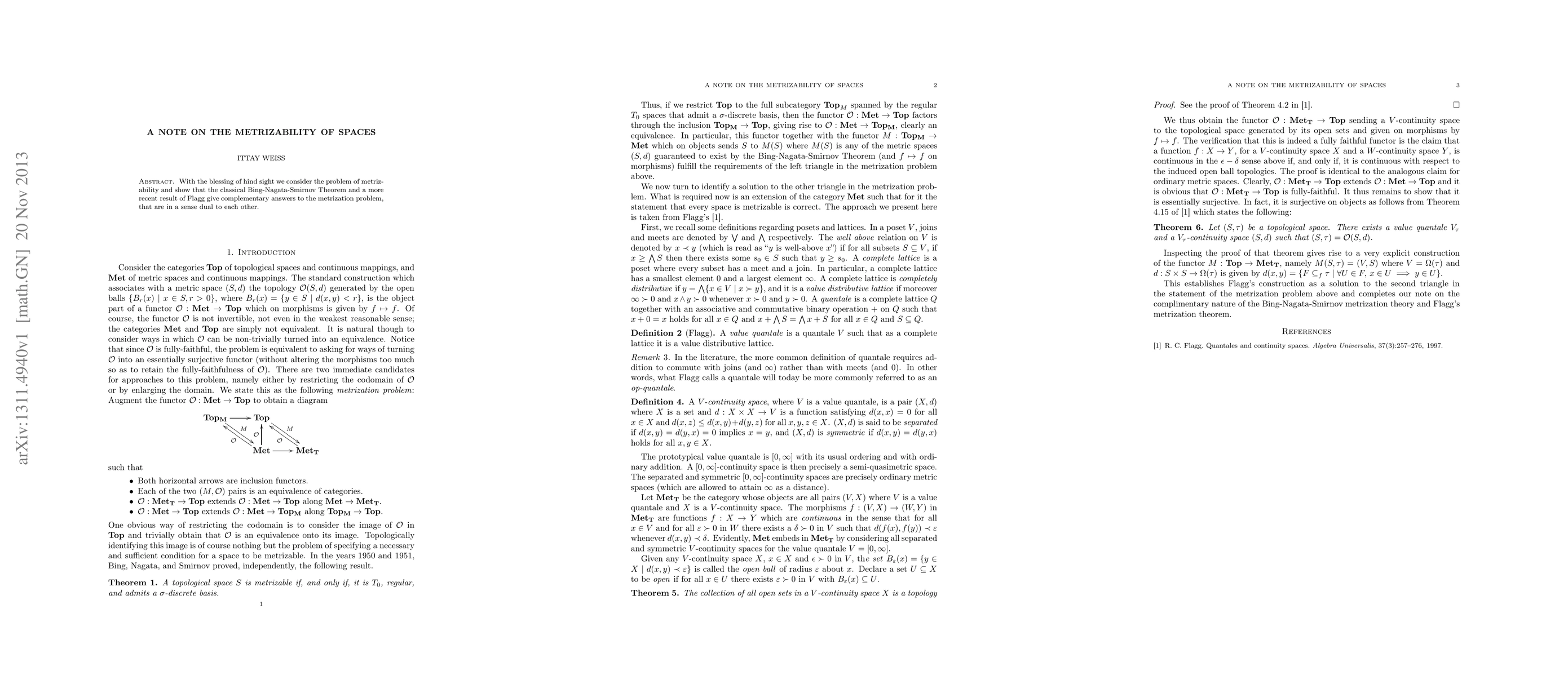 With the blessing of hind sight we consider the problem of metrizability and show that the classical Bing-Nagata-Smirnov Theorem and a more recent result of Flagg give complementary answers to the metrization problem, that are in a sense dual to each other.