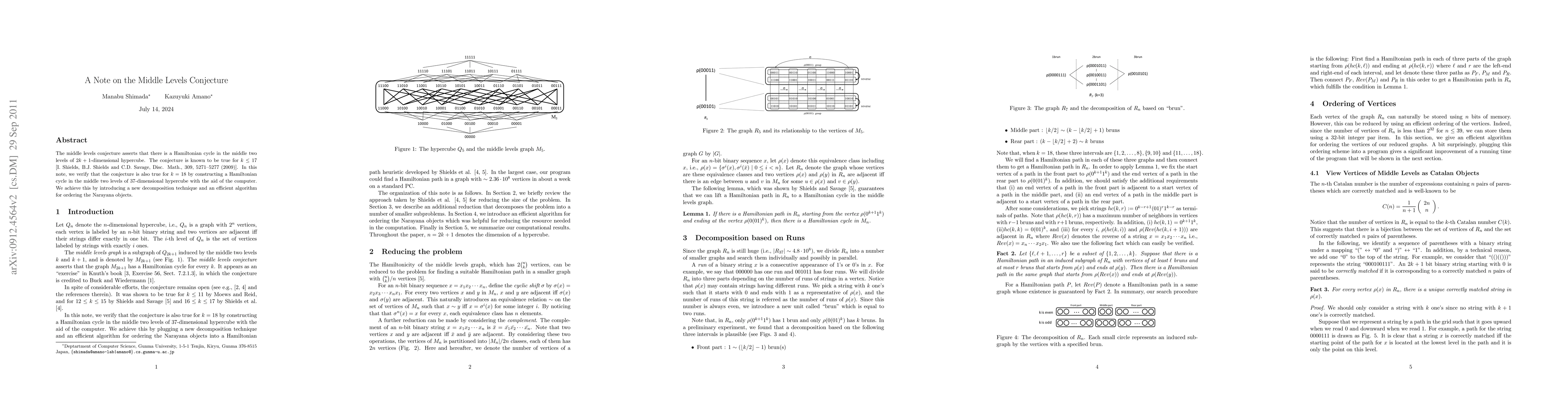 The middle levels conjecture asserts that there is a Hamiltonian cycle in the middle two levels of $2k+1$-dimensional hypercube. The conjecture is known to be true for $k \leq 17$ [I.Shields, B.J.Shields and C.D.Savage, Disc. Math., 309, 5271--5277 (2009)]. In this note, we verify that the conjecture is also true for $k=18$ by constructing a Hamiltonian cycle in the middle two levels of 37-dimensional hypercube with the aid of the computer. We achieve this by introducing a new decomposition technique and an efficient algorithm for ordering the Narayana objects.