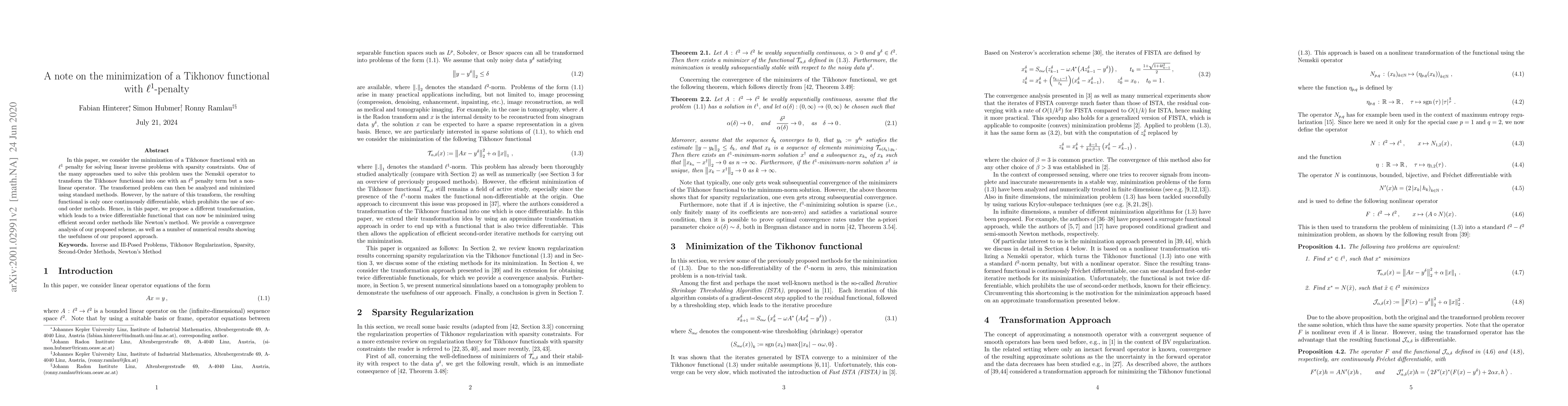 Researchers propose a new method to minimize a Tikhonov functional with an $ell_1$ penalty for linear inverse problems with sparsity constraints, enabling the use of efficient second-order methods like Newton's method.