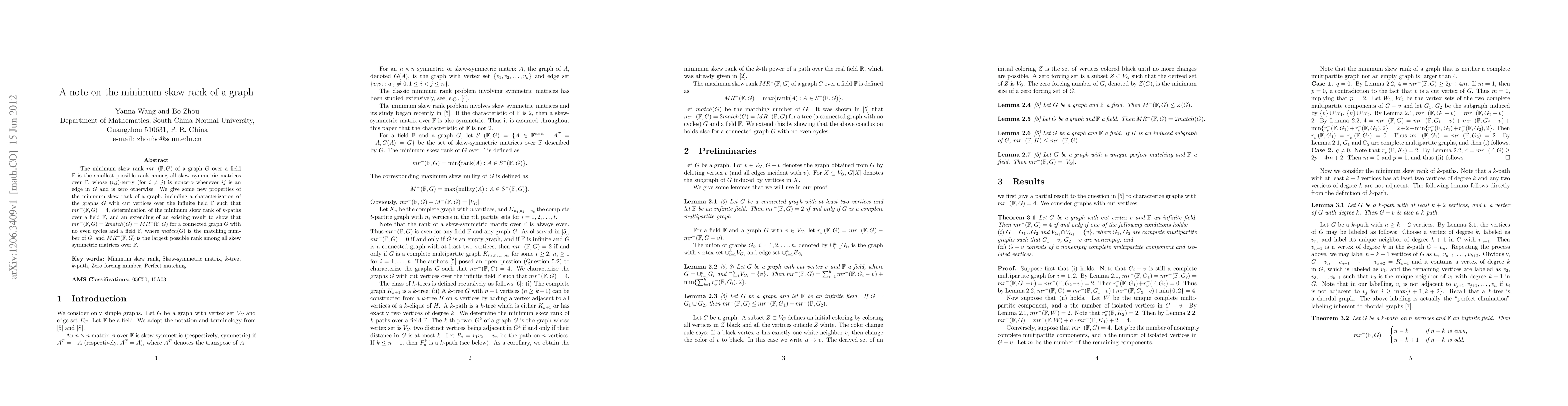 This paper explores the minimum skew rank $mr^{-}(\mathbb{F},G)$ of a graph $G$ over a field $\mathbb{F}$, establishing properties including the characterization of graphs with cut vertices where $mr^{-}(\mathbb{F},G)=4$ and determining the minimum skew rank of $k$-paths. It also extends a result showing $mr^{-}(\mathbb{F},G)=2match(G)=MR^{-}(\mathbb{F},G)$ for connected graphs without even cycles.
