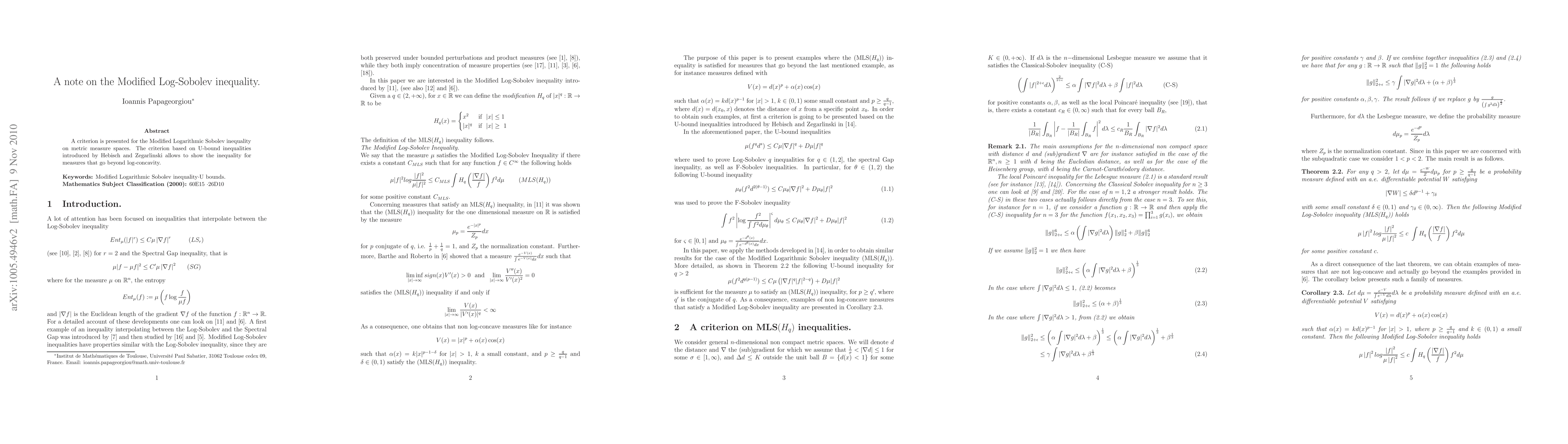 Summary: This paper presents a criterion for the Modified Logarithmic Sobolev inequality on metric measure spaces using U-bound inequalities, extending the applicability beyond log-concave measures. The approach leverages results introduced by Hebisch and Zegarlinski.