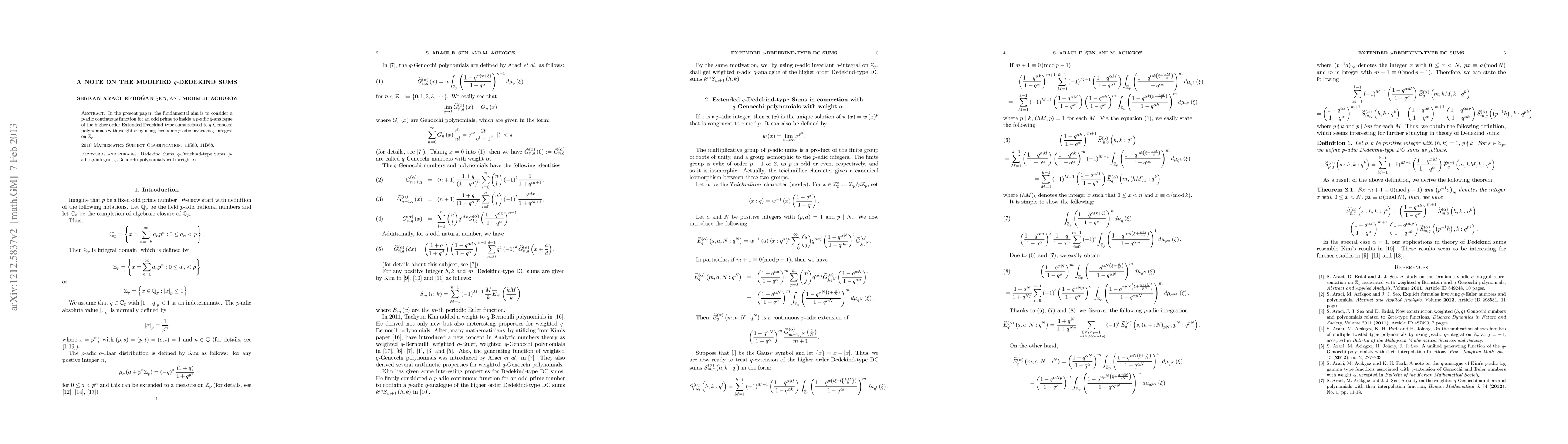 Summary: This paper explores a p-adic continuous function associated with modified Dedekind-type sums, focusing on a q-analogue linked to q-Genocchi polynomials, utilizing fermionic p-adic invariant q-integral on Zp. The study employs p-adic number theory for its mathematical framework.