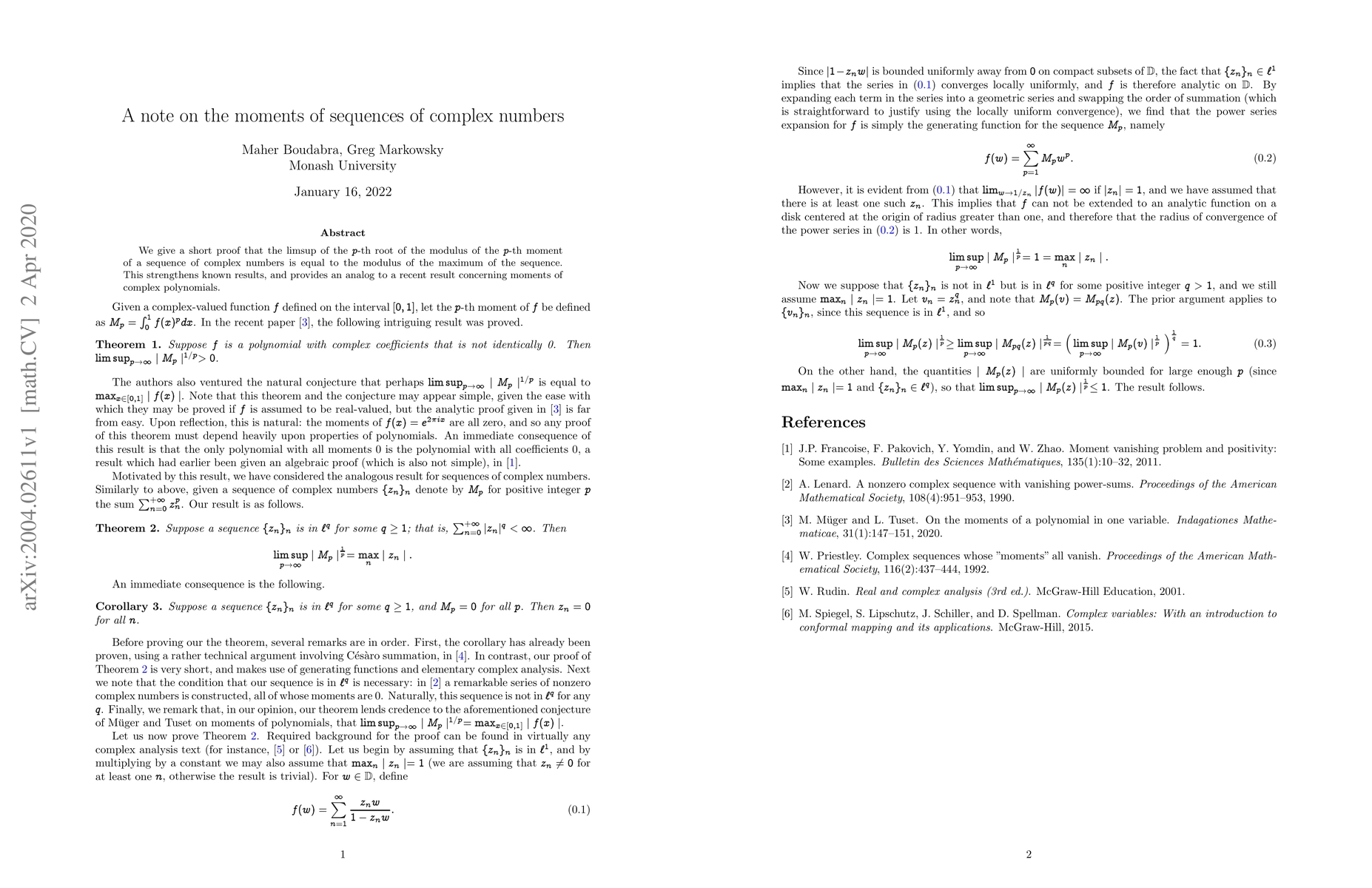 We give a short proof that the limsup of the p-th root of the modulus of the p-th moment of a sequence of complex numbers is equal to the modulus of the maximum of the sequence.This strengthens known results, and provides an analog to a recent result concerning moments of complex polynomials.