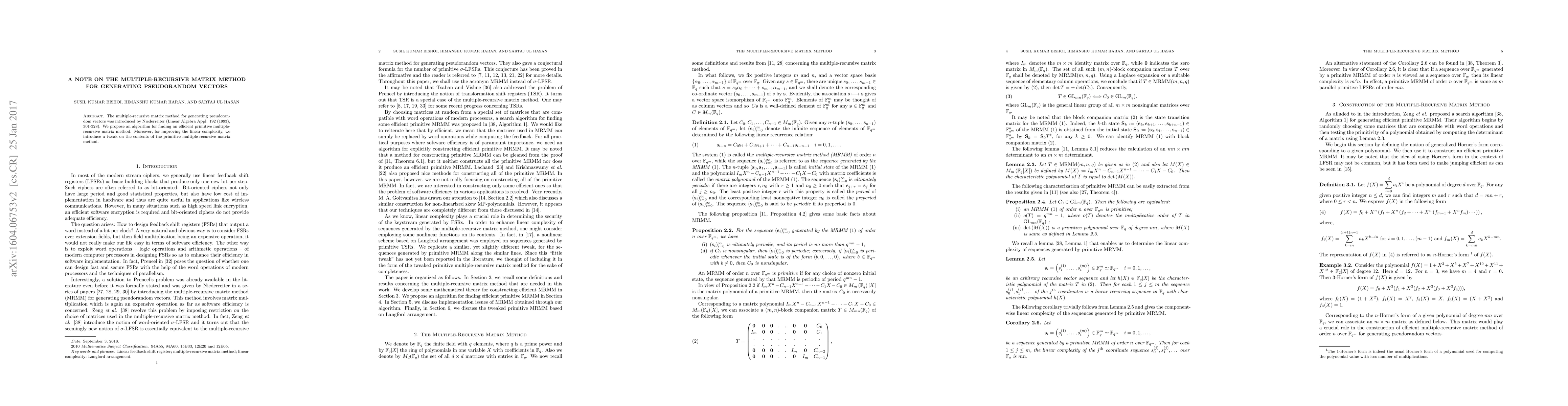 This paper proposes an algorithm to efficiently find a primitive multiple-recursive matrix method for generating pseudorandom vectors, along with a tweak to enhance the linear complexity of the method.