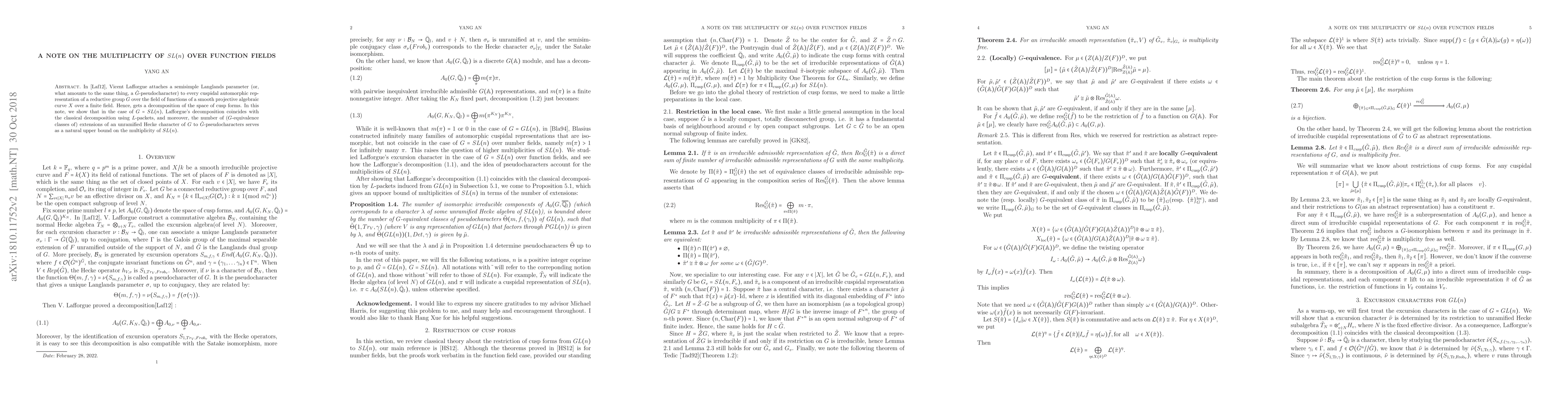 In \cite{lafforgue2012chtoucas}, Vicent Lafforgue attaches a semisimple Langlands parameter (or, what amounts to the same thing, a $\hat{G}$-pseudocharacter) to every cuspidal automorphic representation of a reductive group $G$ over the field of functions of a smooth projective algebraic curve $X$ over a finite field. Hence, gets a decomposition of the space of cusp forms. In this note, we show that in the case of $G = SL(n)$, Lafforgue's decomposition coincides with the classical decomposition using $L$-packets, and moreover, the number of ($G$-equivalence classes of) extensions of an unramified Hecke character of $G$ to $\hat{G}$-pseudocharacters serves as a natural upper bound on the multiplicity of $SL(n)$.