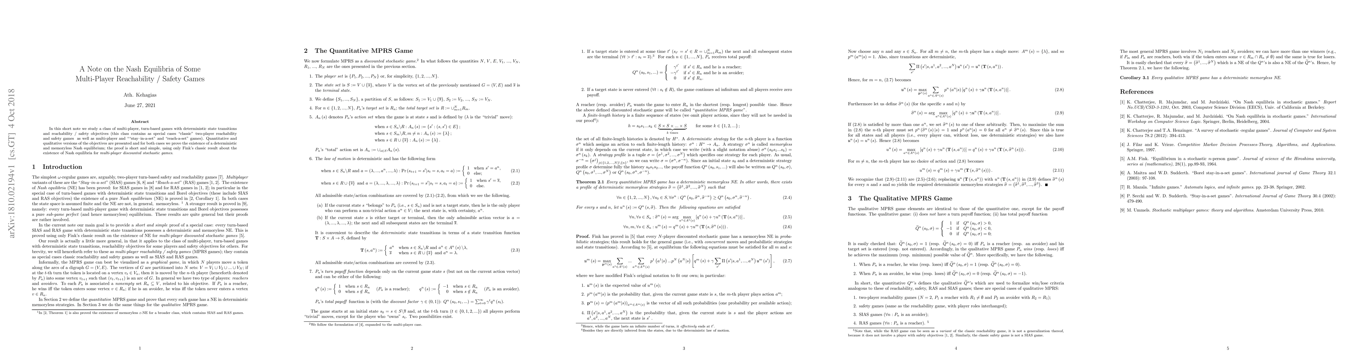 In this short note we study a class of multi-player, turn-based games with deterministic state transitions and reachability / safety objectives (this class contains as special cases "classic" two-player reachability and safety games as well as multi-player "stay--in-a-set" and "reach-a-set" games). Quantitative and qualitative versions of the objectives are presented and for both cases we prove the existence of a deterministic and memoryless Nash equilibrium; the proof is short and simple, using only Fink's classic result about the existence of Nash equilibria for multi-player discounted stochastic games.