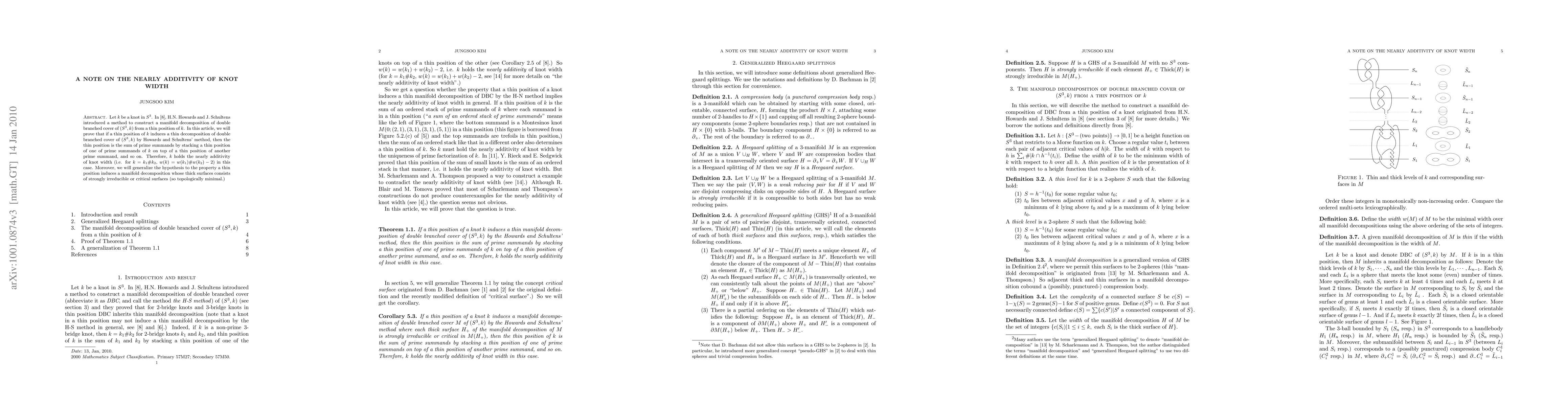 Let k be a knot in S3. In [8], H.N. Howards and J. Schultens introduced a method to construct a manifold decomposition of double branched cover of (S3, k) from a thin position of k. In this article, we will prove that if a thin position of k induces a thin decomposition of double branched cover of (S3,k) by Howards and Schultens' method, then the thin position is the sum of prime summands by stacking a thin position of one of prime summands of k on top of a thin position of another prime summand, and so on. Therefore, k holds the nearly additivity of knot width (i.e. for k = k1#k2, w(k) = w(k1)#w(k2) - 2) in this case. Moreover, we will generalize the hypothesis to the property a thin position induces a manifold decomposition whose thick surfaces consists of strongly irreducible or critical surfaces (so topologically minimal.)