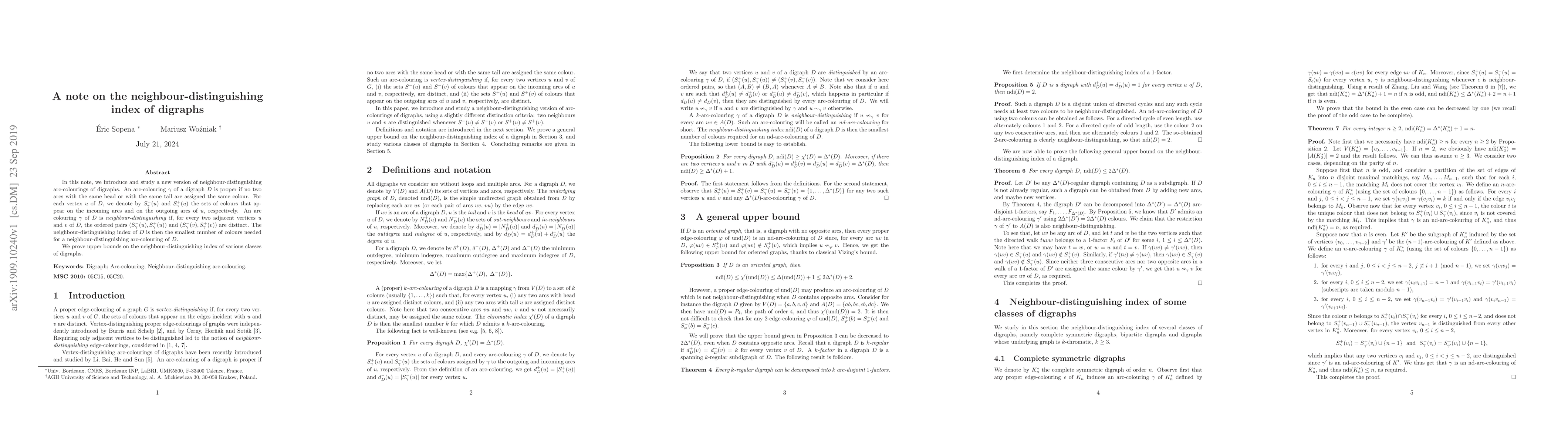 This paper introduces a new concept of neighbour-distinguishing arc-colourings for digraphs, where each arc must be coloured such that adjacent vertices have distinct colour sets for their incoming and outgoing arcs. The study provides upper bounds on the neighbour-distinguishing index for various digraph classes.
