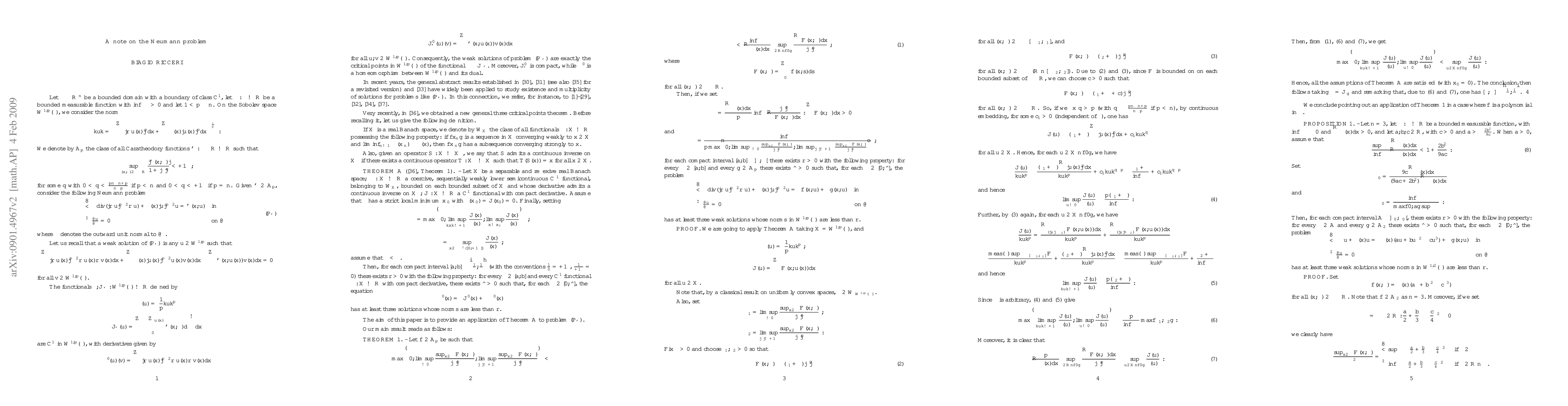 Summary: This paper applies a recent three critical points theorem to solve the Neumann problem, offering a novel approach to the issue. The methodology highlights the theorem's effectiveness in addressing boundary value problems.
