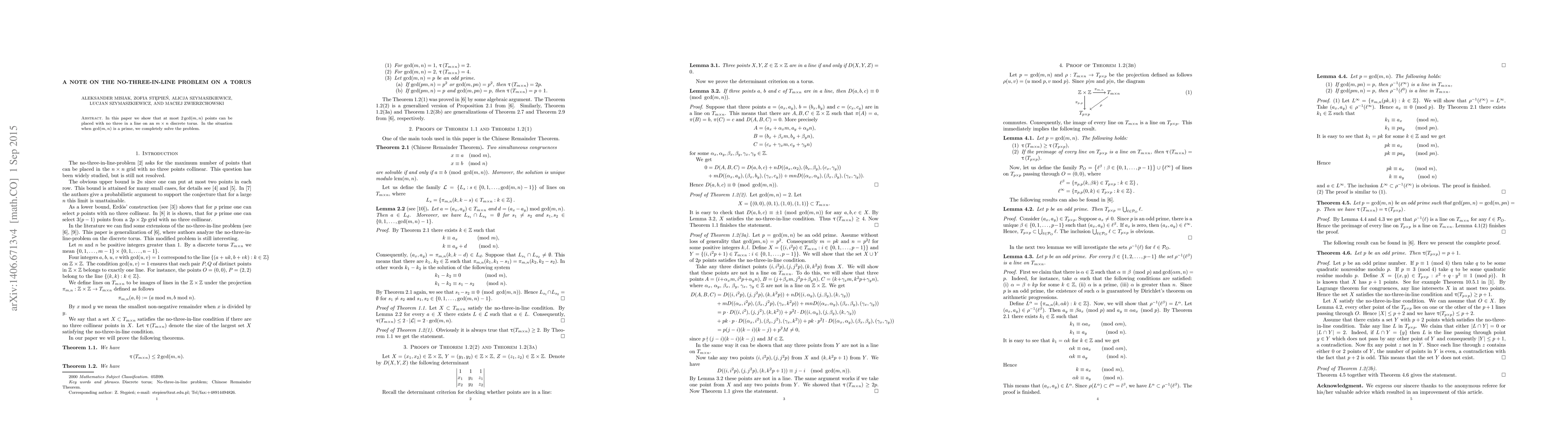Summary: This paper demonstrates that no more than $2 \gcd(m,n)$ points can be arranged on an $m\times n$ torus without three being collinear, and it fully resolves the problem when $\gcd(m,n)$ is a prime number.