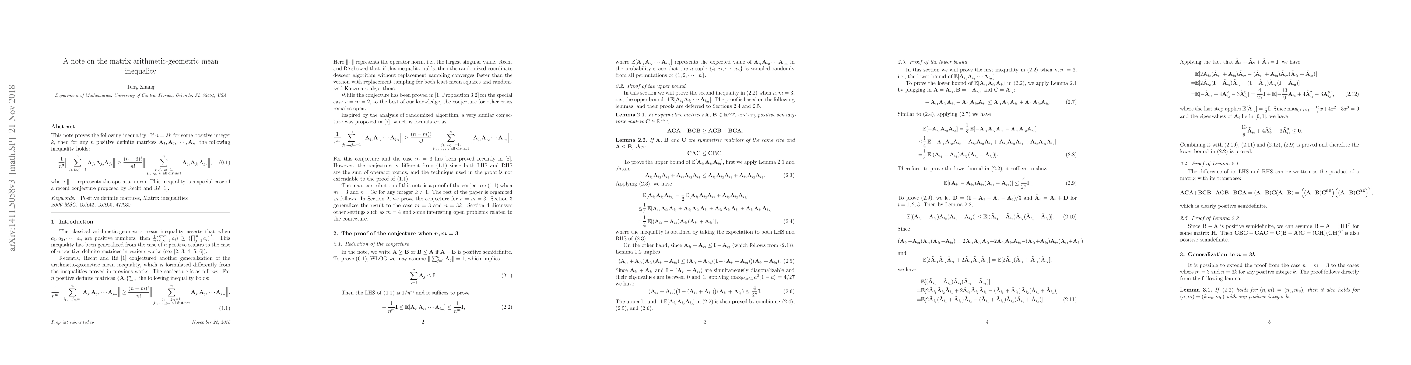 This note proves the following inequality: if $n=3k$ for some positive integer $k$, then for any $n$ positive definite matrices $A_1,A_2,\cdots,A_n$, \begin{equation} \frac{1}{n^3}\Big\|\sum_{j_1,j_2,j_3=1}^{n}A_{j_1}A_{j_2}A_{j_3}\Big\| \geq \frac{(n-3)!}{n!} \Big\|\sum_{\substack{j_1,j_2,j_3=1,\\\text{$j_1$, $j_2$, $j_3$ all distinct}}}^{n}A_{j_1}A_{j_2}A_{j_3}\Big\|, \end{equation} where $\|\cdot\|$ represents the operator norm. This inequality is a special case of a recent conjecture by Recht and R\'e.