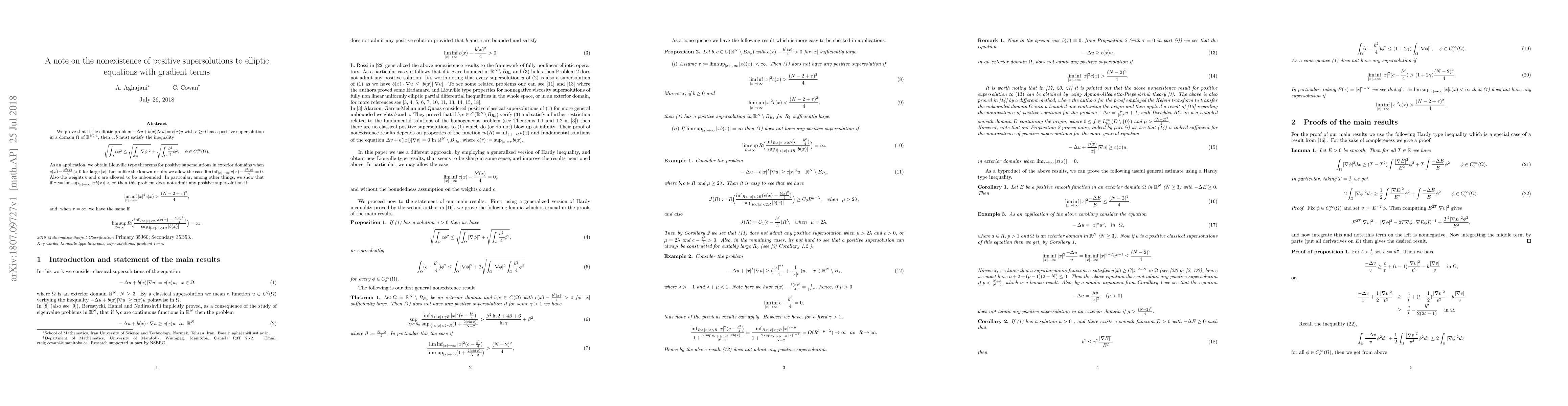 We prove that if the elliptic problem $-\Delta u+b(x)|\nabla u|=c(x)u$ with $c\ge0$ has a positive supersolution in a domain $\Omega$ of $ \IR^{N\ge 3}$, then $c,b$ must satisfy the inequality \[\sqrt{ \int_\Omega c\phi^2}\le \sqrt{ \int_\Omega | \nabla\phi|^2}+\sqrt{ \int_\Omega \frac{b^2}{4}\phi^2},~~~\phi \in C_c^\infty(\Omega).\] As an application, we obtain Liouville type theorems for positive supersolutions in exterior domains when $c(x)-\frac{b^2(x)}{4}>0$ for large $|x|$, but unlike the known results we allow the case $\liminf_{|x|\rightarrow\infty}c(x)-\frac{b^2(x)}{4}=0$. Also the weights $b$ and $c$ are allowed to be unbounded. In particular, among other things, we show that if $\tau:=\limsup_{|x| \rightarrow\infty}|xb(x)|<\infty$ then this problem does not admit any positive supersolution if \[\liminf_{|x| \rightarrow\infty}|x|^2c(x)> \frac{(N-2+\tau)^2}{4},\] and, when $\tau=\infty, $ we have the same if \[\limsup_{R\rightarrow\infty} R\Big(\frac{ \inf_{R<|x|<2 R} (c(x)-\frac{b(x)^2}{4})}{\sup_{\frac{R}{2}<|x|<4 R}|b(x)|}\Big)=\infty.\]
