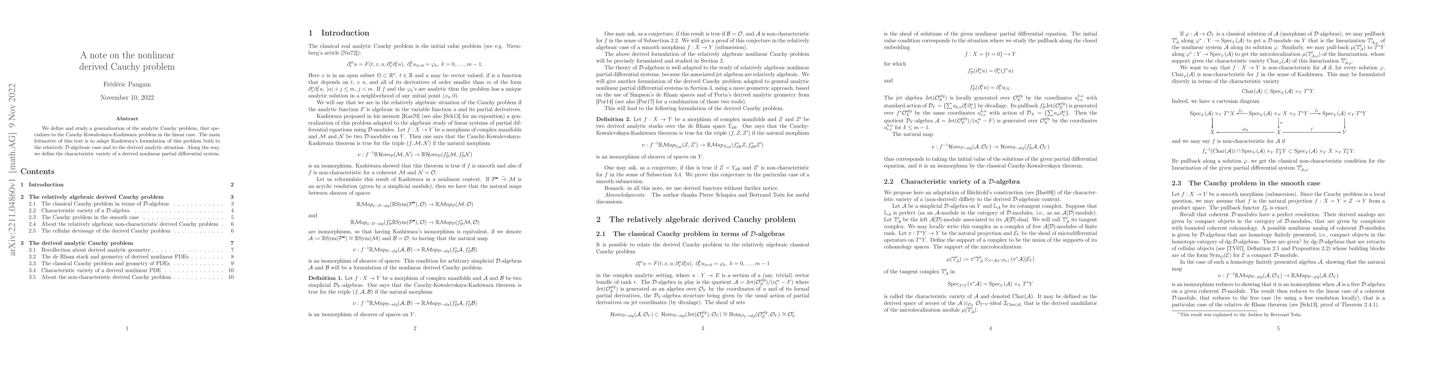 We define and study a generalization of the analytic Cauchy problem, that specializes to the Cauchy-Kowaleskaya-Kashiwara problem in the linear case. The main leitmotive of this text is to adapt Kashiwara's formulation of this problem both to the relatively D-algebraic case and to the derived analytic situation. Along the way, we define the characteristic variety of a derived nonlinear partial differential system.