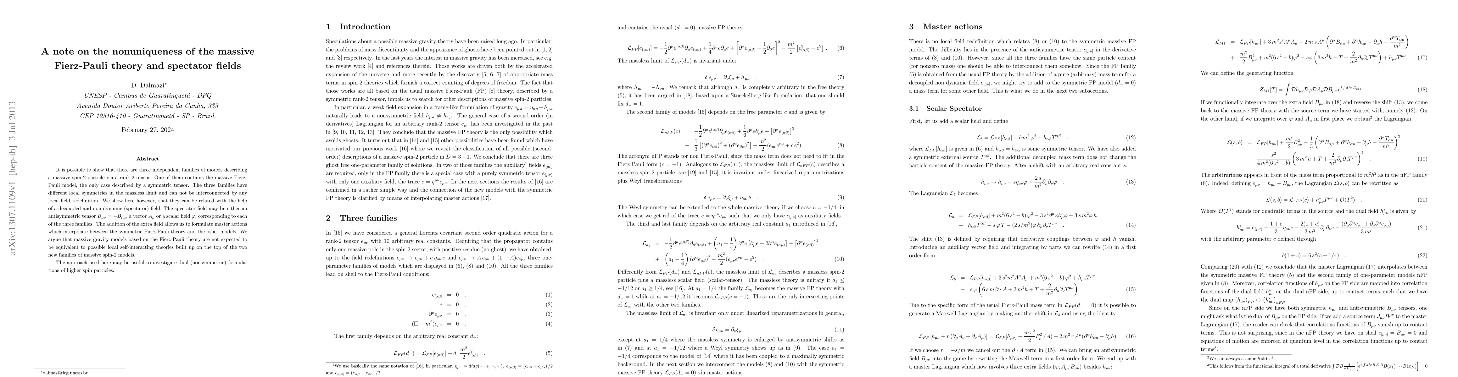 It is possible to show that there are three independent families of models describing a massive spin-2 particle via a rank-2 tensor. One of them contains the massive Fierz-Pauli model, the only case described by a symmetric tensor. The three families have different local symmetries in the massless limit and can not be interconnected by any local field redefinition. We show here however, that they can be related with the help of a decoupled and non dynamic (spectator) field. The spectator field may be either an antisymmetric tensor $B_{\mu\nu}=-B_{\nu\mu}$, a vector $A_{\mu}$ or a scalar field $\varphi$, corresponding to each of the three families. The addition of the extra field allows us to formulate master actions which interpolate between the symmetric Fierz-Pauli theory and the other models. We argue that massive gravity models based on the Fierz-Pauli theory are not expected to be equivalent to possible local self-interacting theories built up on the top of the two new families of massive spin-2 models. The approach used here may be useful to investigate dual (nonsymmetric) formulations of higher spin particles.