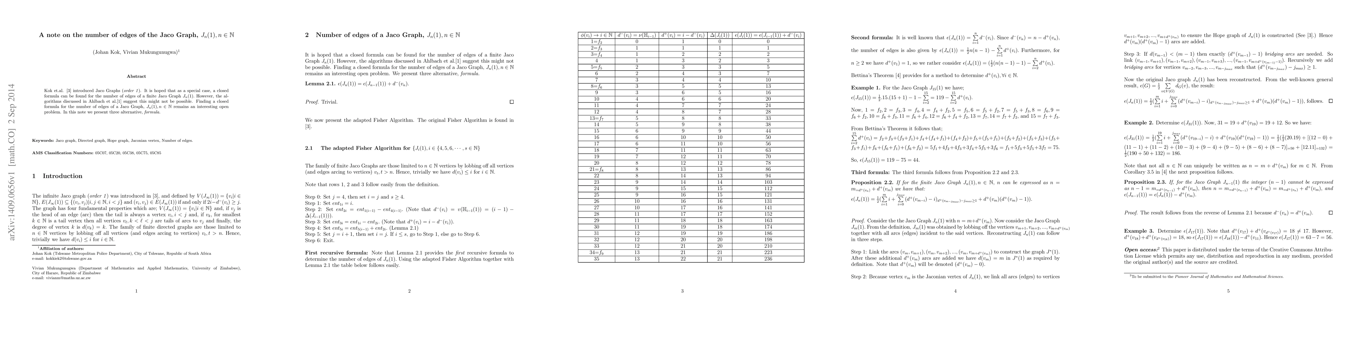 Kok et.al. [3] introduced Jaco Graphs \emph{(order 1)}. It is hoped that as a special case, a closed formula can be found for the number of edges of a finite Jaco Graph $J_n(1)$. However, the algorithms discussed in Ahlbach et.al. [1] suggest this might not be possible. Finding a closed formula for the number of edges of a Jaco Graph $J_n(1), n \in \Bbb N$ remains an interesting open problem. In this note we present three alternative, \emph{formula}.