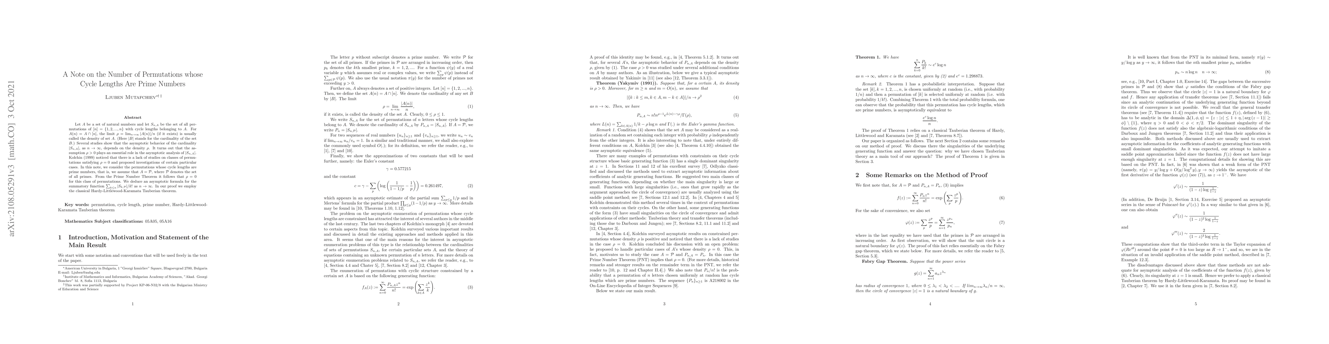 Let $A$ be a set of natural numbers and let $S_{n,A}$ be the set of all permutations of $[n]=\{1,2,...,n\}$ with cycle lengths belonging to $A$. For $A(n)=A\cap [n]$, the limit $\rho=\lim_{n\to\infty}\mid A(n)\mid/n$ (if it esists) is usually called the density of set $A$. (Here $\mid B\mid$ stands for the cardinality of the set $B$.) Several studies show that the asymptotic behavior of the cardinality $\mid S_{n,A}\mid$, as $n\to\infty$, depends on the density $\rho$. It turns out that the asumption $\rho>0$ plays an essential role in the asymptotic analysis of $\mid S_{n,A}\mid$. Kolchin (1999) noticed that there is a lack of studies on classes of permutations satisfying $\rho=0$ and proposed investigations on certain particular cases. In this note, we consider the permutations whose cycle lengths are prime numbers, that is, we assume that $A=\mathcal{P}$, where $\mathcal{P}$ denotes the set of all primes. From the Prime Number Theorem it follows that $\rho=0$ for this class of permutations. We deduce an asymptotic formula for the summatory function $\sum_{k\le n}\mid S_{k,\mathcal{P}}\mid/k!$ as $n\to\infty$. In our proof we employ the classical Hardy-Littlewood-Karamata Tauberian theorem.