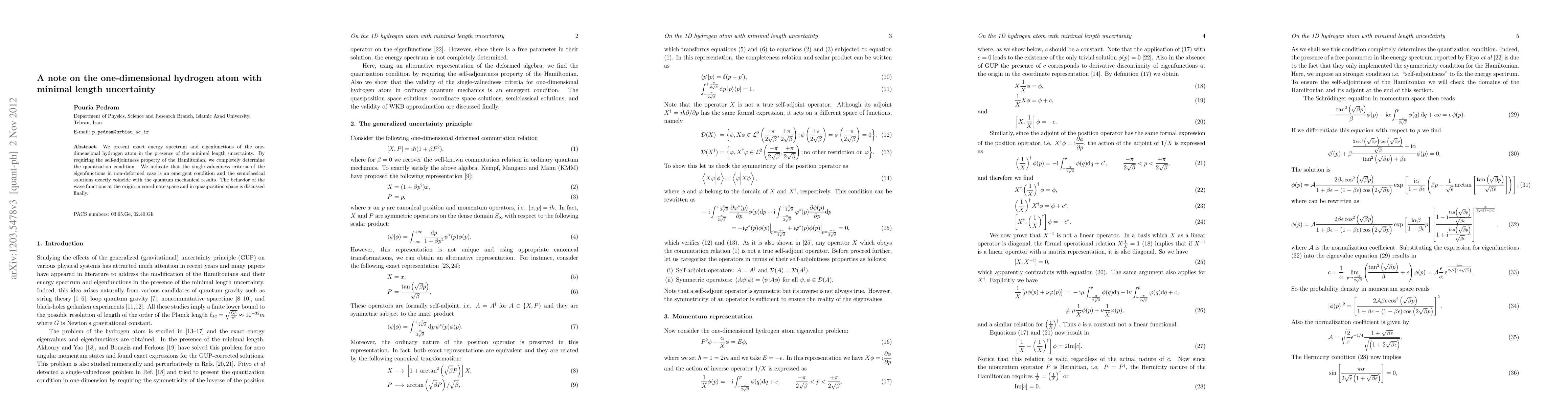 This paper determines the exact energy spectrum and eigenfunctions of a one-dimensional hydrogen atom incorporating minimal length uncertainty, ensuring the Hamiltonian's self-adjointness. It reveals that the single-valuedness criteria of eigenfunctions in the non-deformed case are emergent, and semiclassical solutions align precisely with quantum mechanical results.