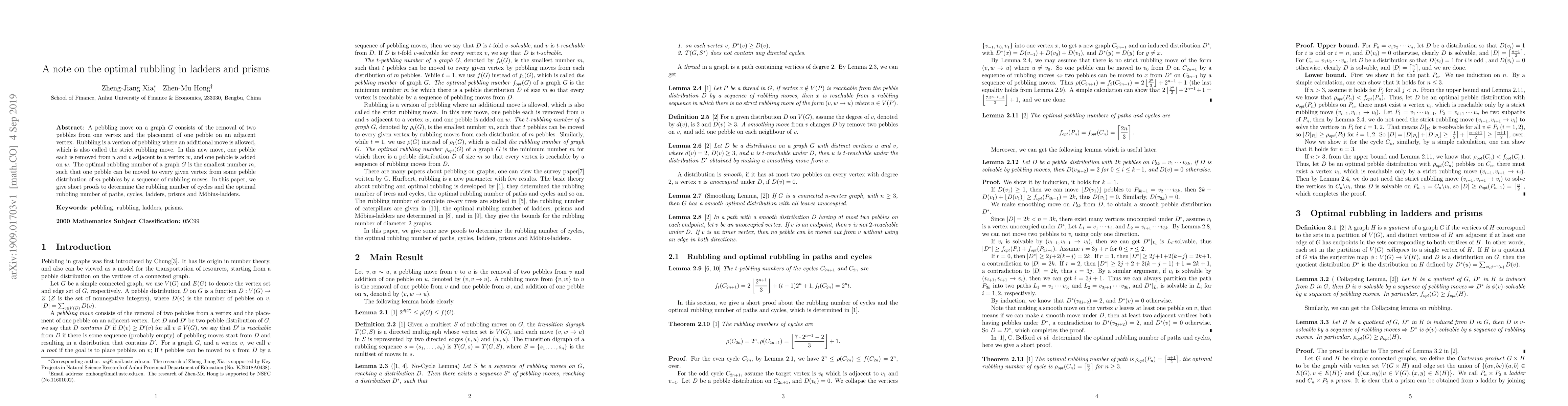 A pebbling move on a graph G consists of the removal of two pebbles from one vertex and the placement of one pebble on an adjacent vertex. Rubbling is a version of pebbling where an additional move is allowed, which is also called the strict rubbling move. In this new move, one pebble each is removed from u and v adjacent to a vertex w, and one pebble is added on w. The optimal rubbling number of a graph G is the smallest number m, such that one pebble can be moved to every given vertex from some pebble distribution of m pebbles by a sequence of rubbling moves. In this paper, we give short proofs to determine the rubbling number of cycles and the optimal rubbling number of paths, cycles, ladders, prisms and Mobius-ladders.