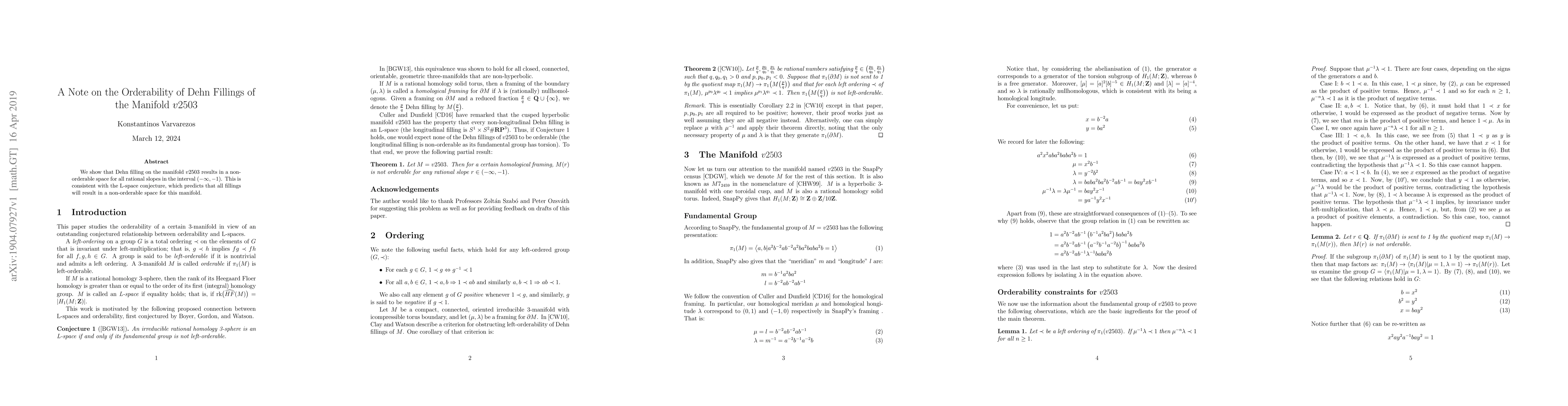 Summary: The study demonstrates that Dehn fillings on the manifold $v2503$ yield non-orderable spaces for all rational slopes below -1, supporting the L-space conjecture. This finding aligns with predictions that all fillings of this manifold result in non-orderable spaces.
