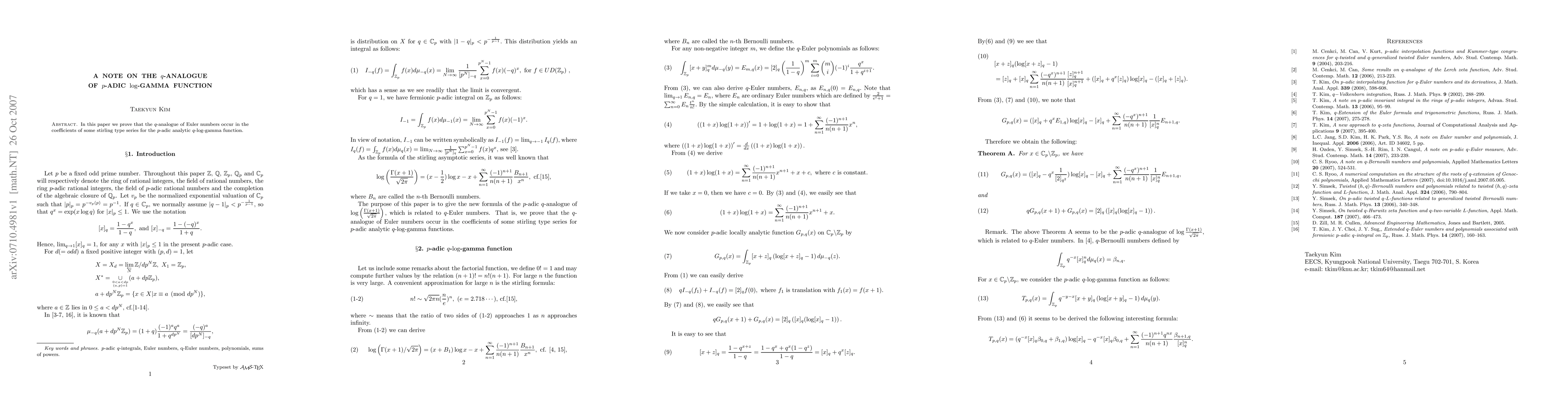Summary: This paper demonstrates the occurrence of q-Euler numbers in the coefficients of certain Stirling-type series for the p-adic analytic q-log gamma function. The study highlights the intricate connections between p-adic analysis and combinatorial number theory.