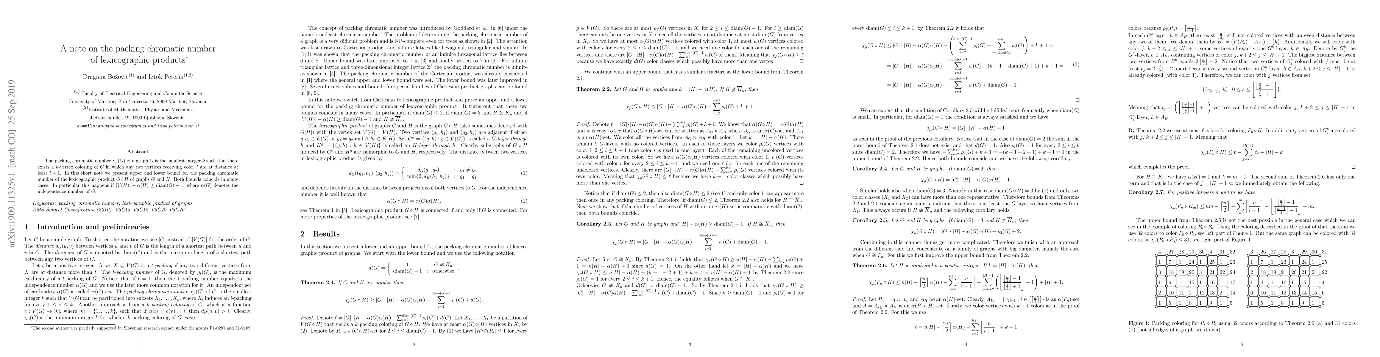 This paper investigates the packing chromatic number $\chi_{\rho}(G)$ of graphs and provides upper and lower bounds for the lexicographic product $G\circ H$. The bounds coincide when $|V(H)|-\alpha(H)\geq {\rm diam}(G)-1$, where $\alpha(H)$ is the independence number of $H$.