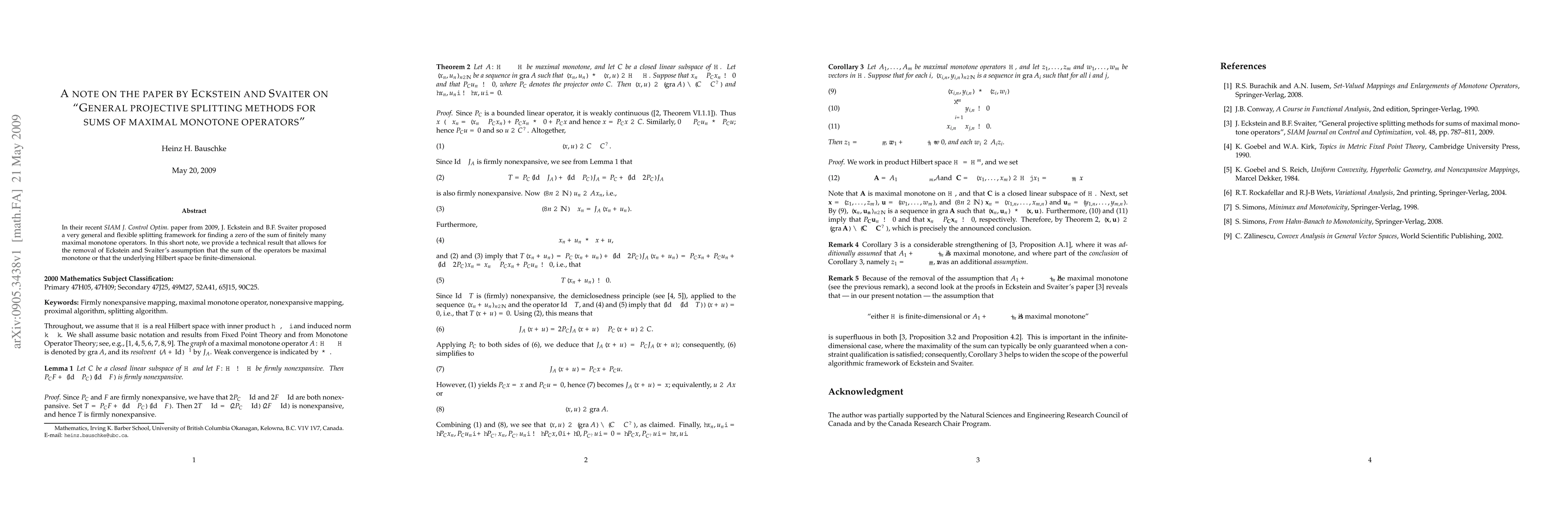 Summary: This note removes the assumption in Eckstein and Svaiter's 2009 SIAM J. Control Optim. paper that the sum of maximal monotone operators must be maximal monotone and that the Hilbert space must be finite-dimensional, broadening the applicability of their general projective splitting method.