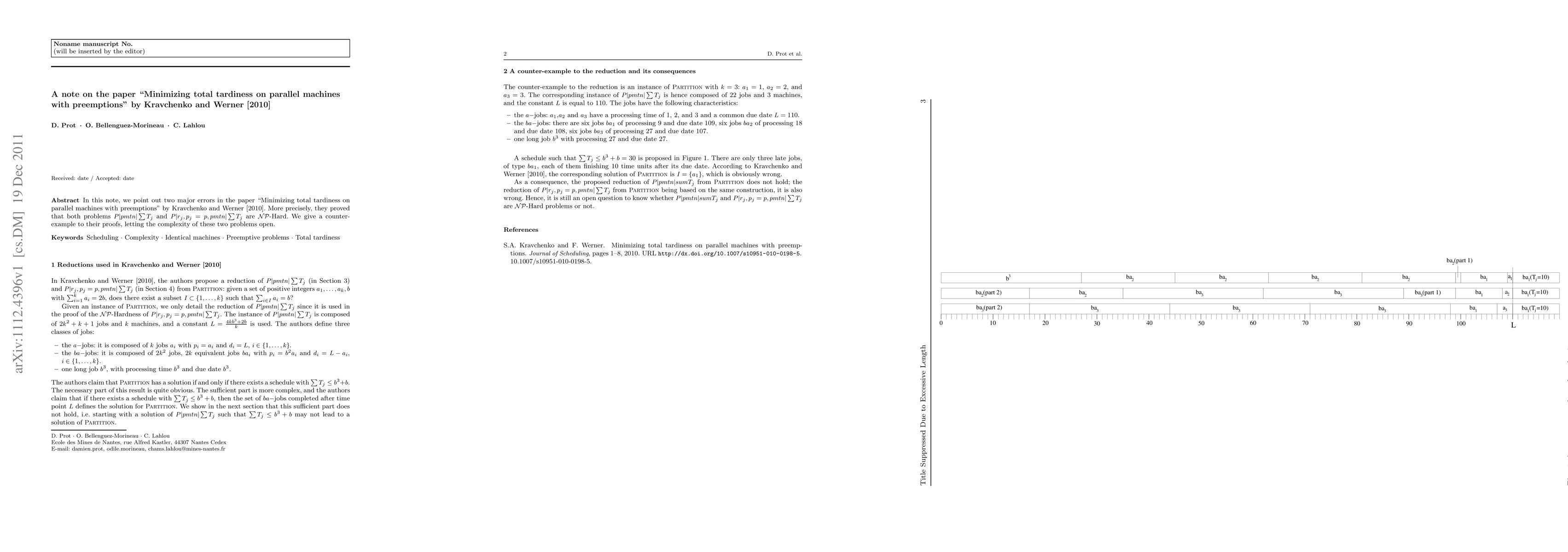 This note identifies two significant errors in Kravchenko and Werner's 2010 paper, which claimed NP-hardness for two scheduling problems. The authors provide a counterexample, invalidating the proofs and leaving the complexity of the problems unresolved.