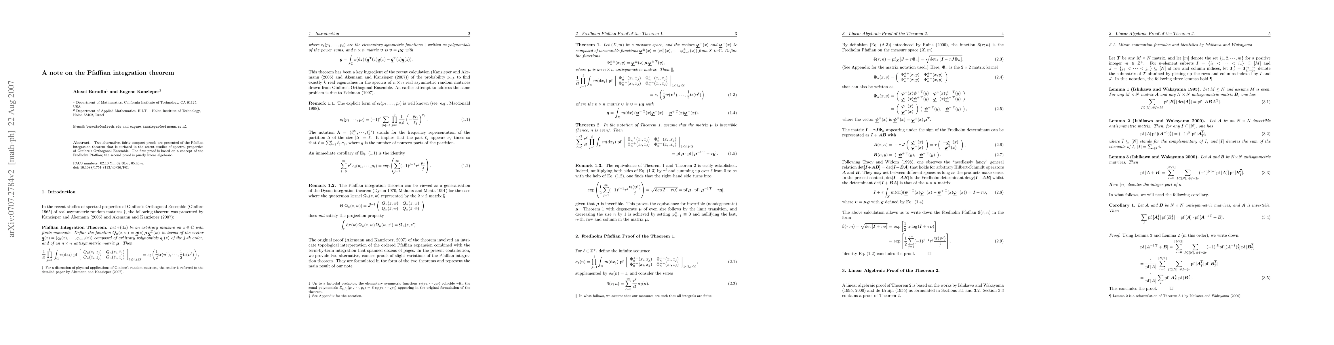 This paper presents two concise proofs of the Pfaffian integration theorem, which is relevant to the spectral properties of Ginibre's Orthogonal Ensemble. The first proof utilizes the Fredholm Pfaffian, while the second is based purely on linear algebra.
