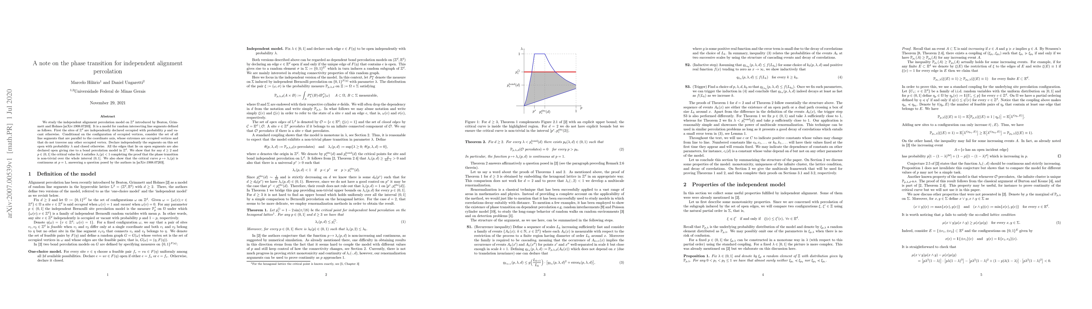 We study the independent alignment percolation model on $\mathbb{Z}^d$ introduced by Beaton, Grimmett and Holmes [arXiv:1908.07203]. It is a model for random intersecting line segments defined as follows. First the sites of $\mathbb{Z}^d$ are independently declared occupied with probability $p$ and vacant otherwise. Conditional on the configuration of occupied vertices, consider the set of all line segments that are parallel to the coordinate axis, whose extremes are occupied vertices and that do not traverse any other occupied vertex. Declare independently the segments on this set open with probability $\lambda$ and closed otherwise. All the edges that lie on open segments are also declared open giving rise to a bond percolation model in $\mathbb{Z}^d$. We show that for any $d \geq 2$ and $p \in (0,1]$ the critical value for $\lambda$ satisfies $\lambda_c(p)<1$ completing the proof that the phase transition is non-trivial over the whole interval $(0,1]$. We also show that the critical curve $p \mapsto \lambda_c(p)$ is continuous at $p=1$, answering a question posed by the authors in [arXiv:1908.07203].