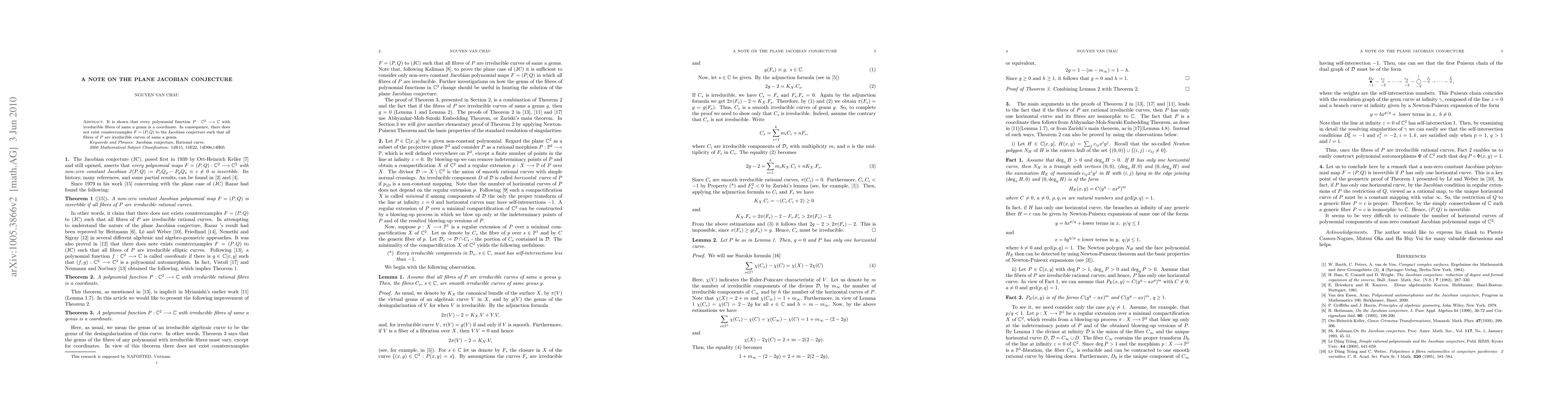 It is shown that every polynomial function $P : \mathbb{C}^2\longrightarrow \mathbb{C}$ with irreducible fibres of same a genus is a coordinate. In consequence, there does not exist counterexamples F = (P,Q) to the Jacobian conjecture such that all fibres of P are irreducible curves of same a genus.