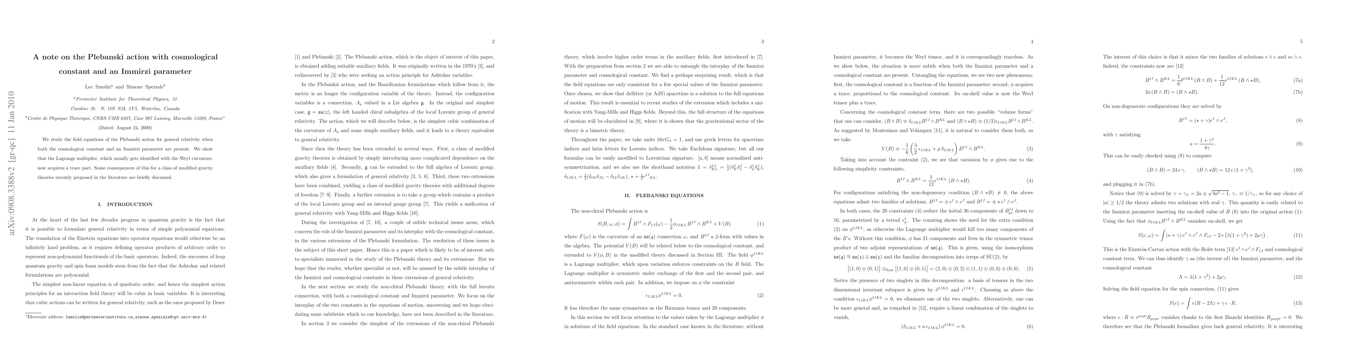 We study the field equations of the Plebanski action for general relativity when both the cosmological constant and an Immirzi parameter are present. We show that the Lagrange multiplier, which usually gets identified with the Weyl curvature, now acquires a trace part. Some consequences of this for a class of modified gravity theories recently proposed in the literature are briefly discussed.