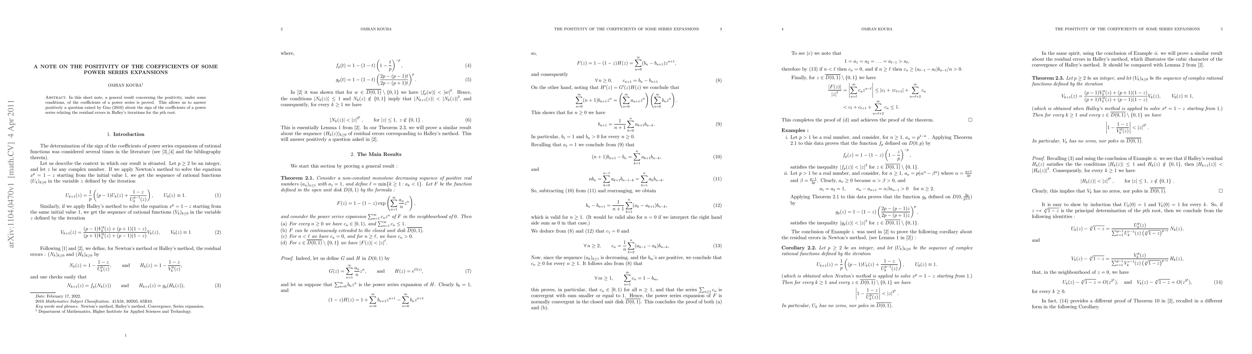 In this short note, a general result concerning the positivity, under some conditions, of the coefficients of a power series is proved. This allows us to answer positively a question raised by Guo (2010) about the sign of the coefficients of a power series relating the residual errors in Halley's iterations for the $p$th root.