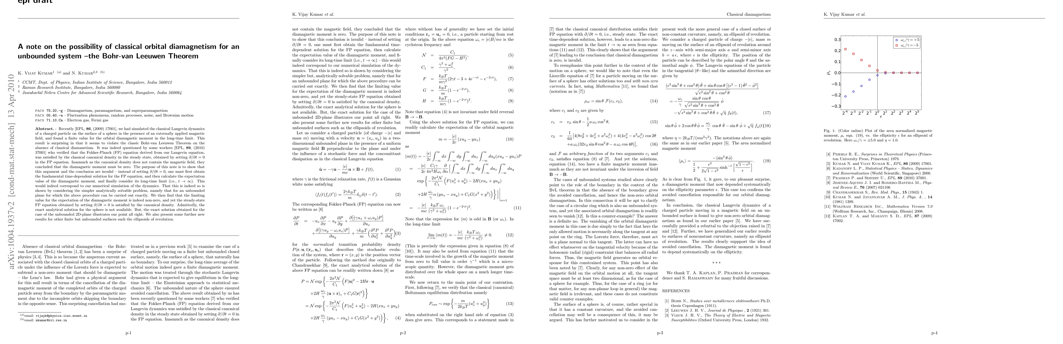 Recently [EPL, 86, (2009) 17001], we had simulated the classical Langevin dynamics of a charged particle on the surface of a sphere in the presence of an externally applied magnetic field, and found a finite value for the orbital diamagnetic moment in the long-time limit. This result is surprising in that it seems to violate the classic Bohr-van Leeuwen Theorem on the absence of classical diamagnetism. It was indeed questioned by some workers [EPL, 89, (2010) 37001] who verified that the Fokker-Planck (FP) equation derived from our Langevin equation, was satisfied by the classical canonical density in the steady state, obtained by setting d/dt=0 in the FP equation. Inasmuch as the canonical density does not contain the magnetic field, they concluded that the diamagnetic moment must be zero. The purpose of this note is to show that this argument and the conclusion are invalid -- instead of setting d/dt=0 one must first obtain the fundamental time-dependent solution for the FP equation, and then calculate the expectation value of the diamagnetic moment, and finally consider its long-time limit (i.e., $t \to \infty$). This would indeed correspond to our numerical simulation of the dynamics. That this is indeed so is shown by considering the simpler analytically solvable problem, namely that for an unbounded plane for which the above procedure can be carried out exactly. We then find that the limiting value for the expectation of the diamagnetic moment is indeed non-zero, and yet the steady-state FP equation obtained by setting d/dt=0 is satisfied by the canonical density. Admittedly, the exact analytical solution for the sphere is not available. But, the exact solution obtained for the case of the unbounded 2D-plane illustrates our point all right. We also present some further new results for other finite but unbounded surfaces such the ellipsoids of revolution.