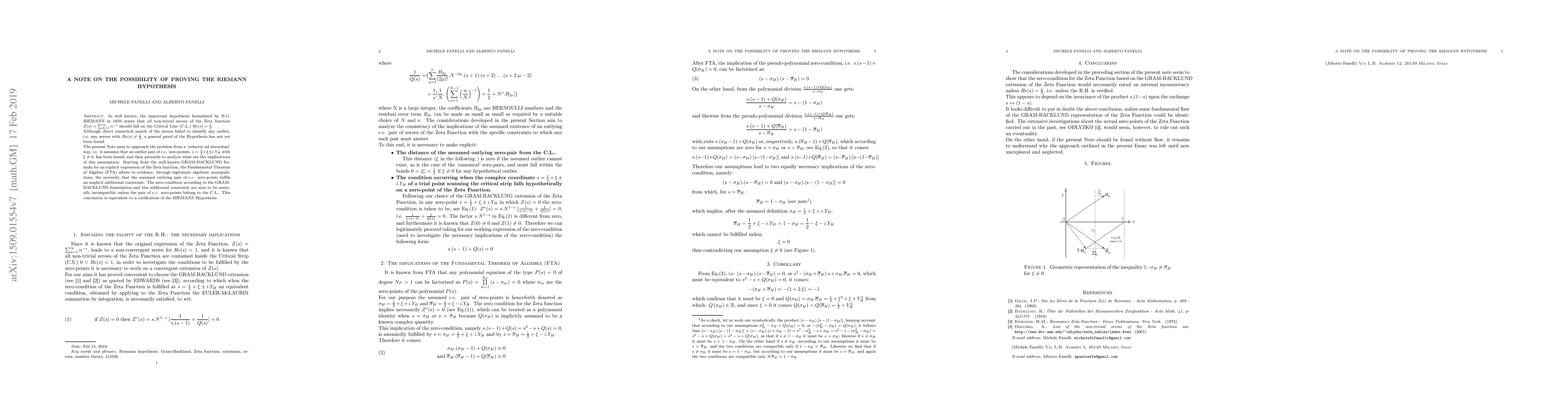 As well known, the important hypothesis formulated by B.G. RIEMANN in 1859 states that all non-trivial zeroes of the Zeta function $Z(s)=\sum_{n=1}^{\infty } n^{-s}$ should fall on the Critical Line (C.L.) $Re(s)=\frac{1}{2}$.\\ Although direct numerical search of the zeroes failed to identify any outlier, i.e. any zeroes with $Re(s)\neq\frac{1}{2}$, a general proof of the Hypothesis has not yet been found.\\ The present Note aims to approach the problem from a 'reductio ad absurdum' way, i.e. it assumes that an outlier pair of c.c. zero-points, $s=\frac{1}{2}+\xi \pm i.Y_H$ with $\xi\neq0$, has been found, and then proceeds to analyze what are the implications of this assumption. Starting from the well-known GRAM-BACKLUND formula for an explicit expression of the Zeta function, the Fundamental Theorem of Algebra (FTA) allows to evidence, through legitimate algebraic manipulations, the necessity that the assumed outlying pair of c.c. zero-points fulfils an implicit additional constraint. The zero-condition according to the GRAM- BACKLUND formulation and this additional constraint are seen to be mutually incompatible unless the pair of c.c. zero-points belong to the C.L.. This conclusion is equivalent to a verification of the RIEMANN Hypothesis.