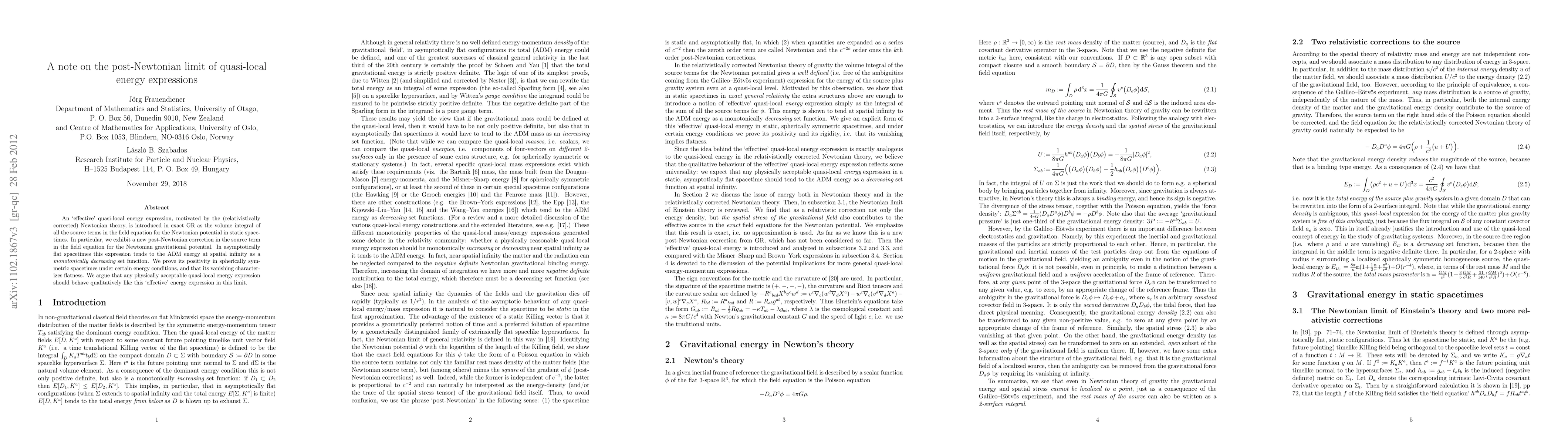 An `effective' quasi-local energy expression, motivated by the (relativistically corrected) Newtonian theory, is introduced in exact GR as the volume integral of all the source terms in the field equation for the Newtonian potential in static spacetimes. In particular, we exhibit a new post-Newtonian correction in the source term in the field equation for the Newtonian gravitational potential. In asymptotically flat spacetimes this expression tends to the ADM energy at the spatial infinity as a {\em monotonically decreasing} set function. We prove its positivity in spherically symmetric spacetimes under certain energy conditions, and that its vanishing characterizes flatness. We argue that any physically acceptable quasi-local energy expression should behave qualitatively like this `effective' energy expression in this limit.