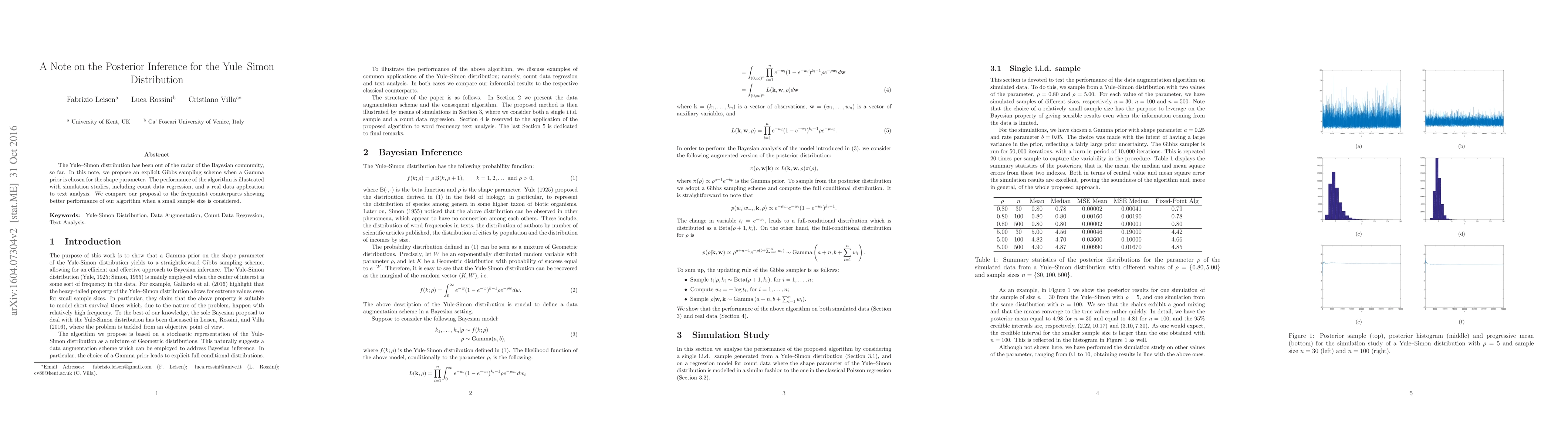 This paper proposes a Gibbs sampling method for posterior inference of the Yule-Simon distribution using a Gamma prior for the shape parameter. Simulation studies and real data applications demonstrate superior performance of the Bayesian approach compared to frequentist methods, especially with small sample sizes.