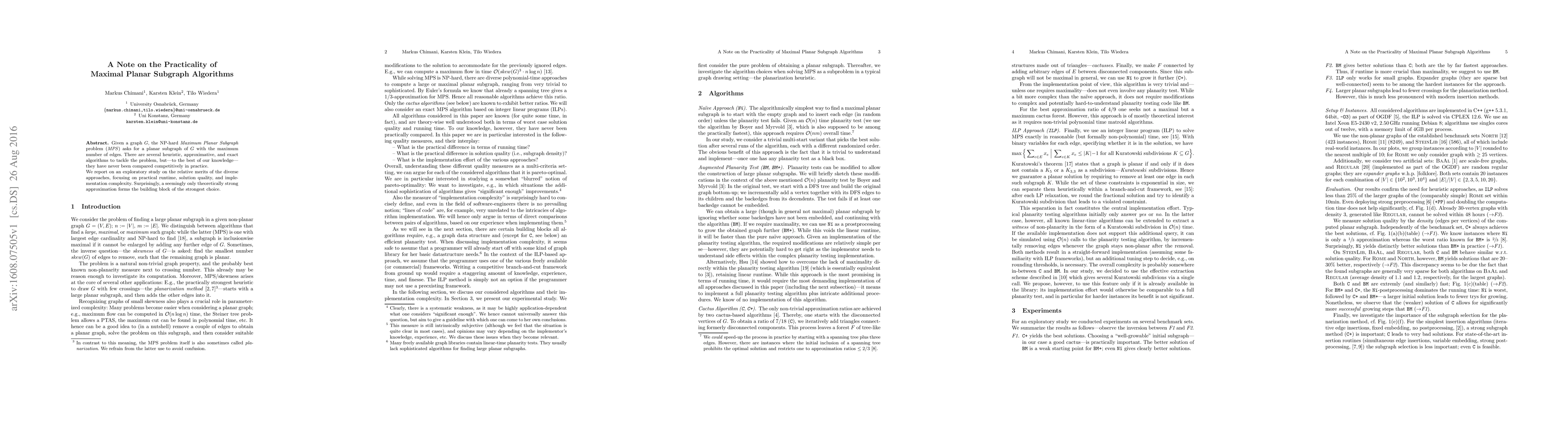 The paper presents a comparative study of various algorithms for solving the Maximum Planar Subgraph problem, assessing their practical runtime, solution quality, and implementation complexity. Contrary to expectations, an approximation algorithm proved to be the most effective in practice.