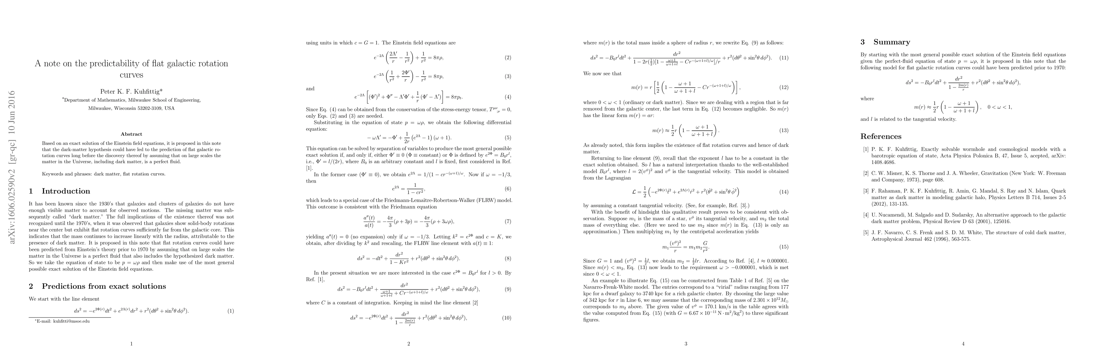 This paper suggests that the dark-matter hypothesis could have predicted flat galactic rotation curves earlier, based on an exact solution of the Einstein field equations. It posits that treating the Universe's matter, including dark matter, as a perfect fluid on large scales could have led to this prediction.