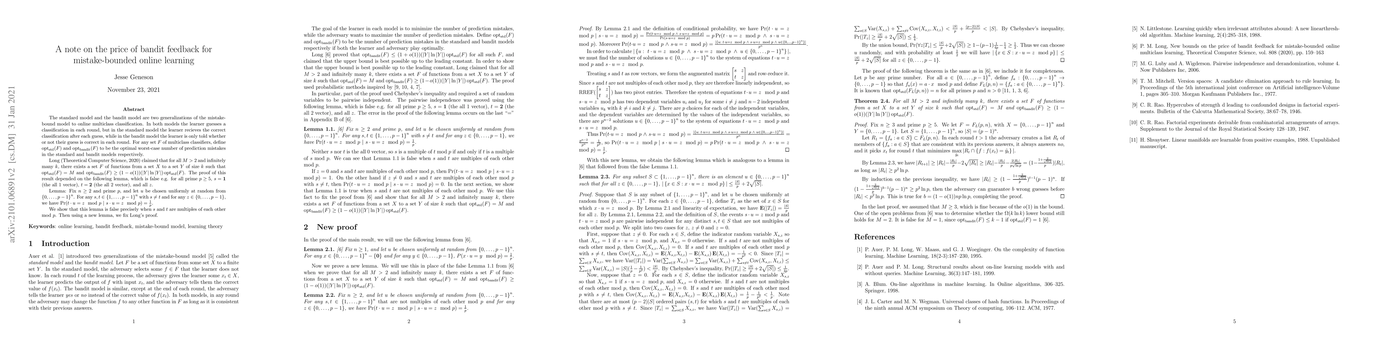 The standard model and the bandit model are two generalizations of the mistake-bound model to online multiclass classification. In both models the learner guesses a classification in each round, but in the standard model the learner recieves the correct classification after each guess, while in the bandit model the learner is only told whether or not their guess is correct in each round. For any set $F$ of multiclass classifiers, define $opt_{std}(F)$ and $opt_{bandit}(F)$ to be the optimal worst-case number of prediction mistakes in the standard and bandit models respectively. Long (Theoretical Computer Science, 2020) claimed that for all $M > 2$ and infinitely many $k$, there exists a set $F$ of functions from a set $X$ to a set $Y$ of size $k$ such that $opt_{std}(F) = M$ and $opt_{bandit}(F) \ge (1 - o(1))(|Y|\ln{|Y|})opt_{std}(F)$. The proof of this result depended on the following lemma, which is false e.g. for all prime $p \ge 5$, $s = \mathbf{1}$ (the all $1$ vector), $t = \mathbf{2}$ (the all $2$ vector), and all $z$. Lemma: Fix $n \ge 2$ and prime $p$, and let $u$ be chosen uniformly at random from $\left\{0, \dots, p-1\right\}^n$. For any $s, t \in \left\{1, \dots, p-1\right\}^n$ with $s \neq t$ and for any $z \in \left\{0, \dots, p-1\right\}$, we have $\Pr(t \cdot u = z \mod p \text{ } | \text{ } s \cdot u = z \mod p) = \frac{1}{p}$. We show that this lemma is false precisely when $s$ and $t$ are multiples of each other mod $p$. Then using a new lemma, we fix Long's proof.